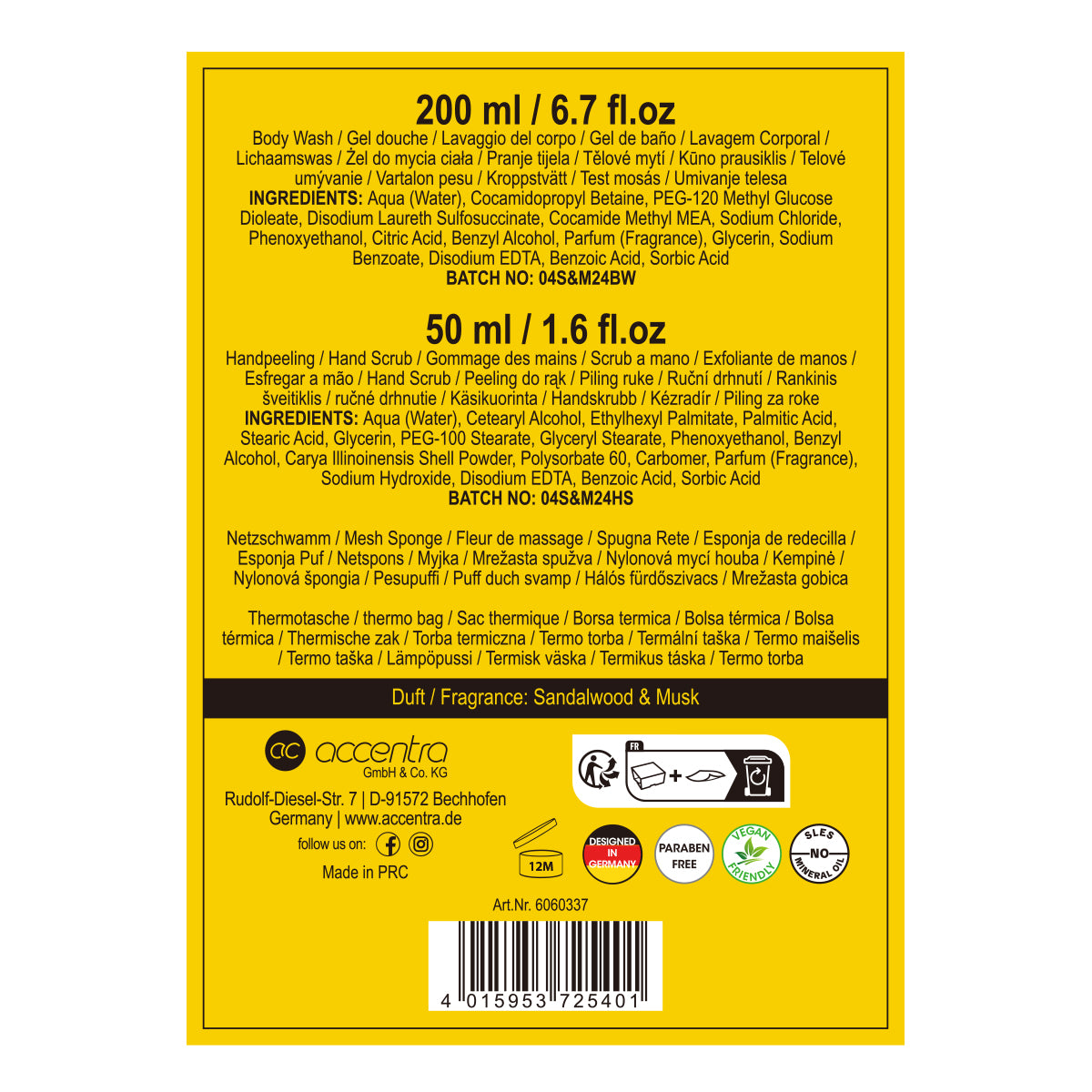 Entdecken Sie das perfekte Geschenkset für Männer in einer stilvollen Thermotasche! Dieses Set enthält einen 200 ml Body Wash und einen 50 ml Hand Scrub, beide mit dem verführerischen Duft von Sandelholz und Moschus. Der 20 g Netzschwamm sorgt für ein luxuriöses Reinigungserlebnis. Ideal für Reisen oder als pflegende Ergänzung für die tägliche Routine – verwöhnen Sie sich oder Ihre Liebsten mit diesem praktischen und eleganten Set von Accentra!