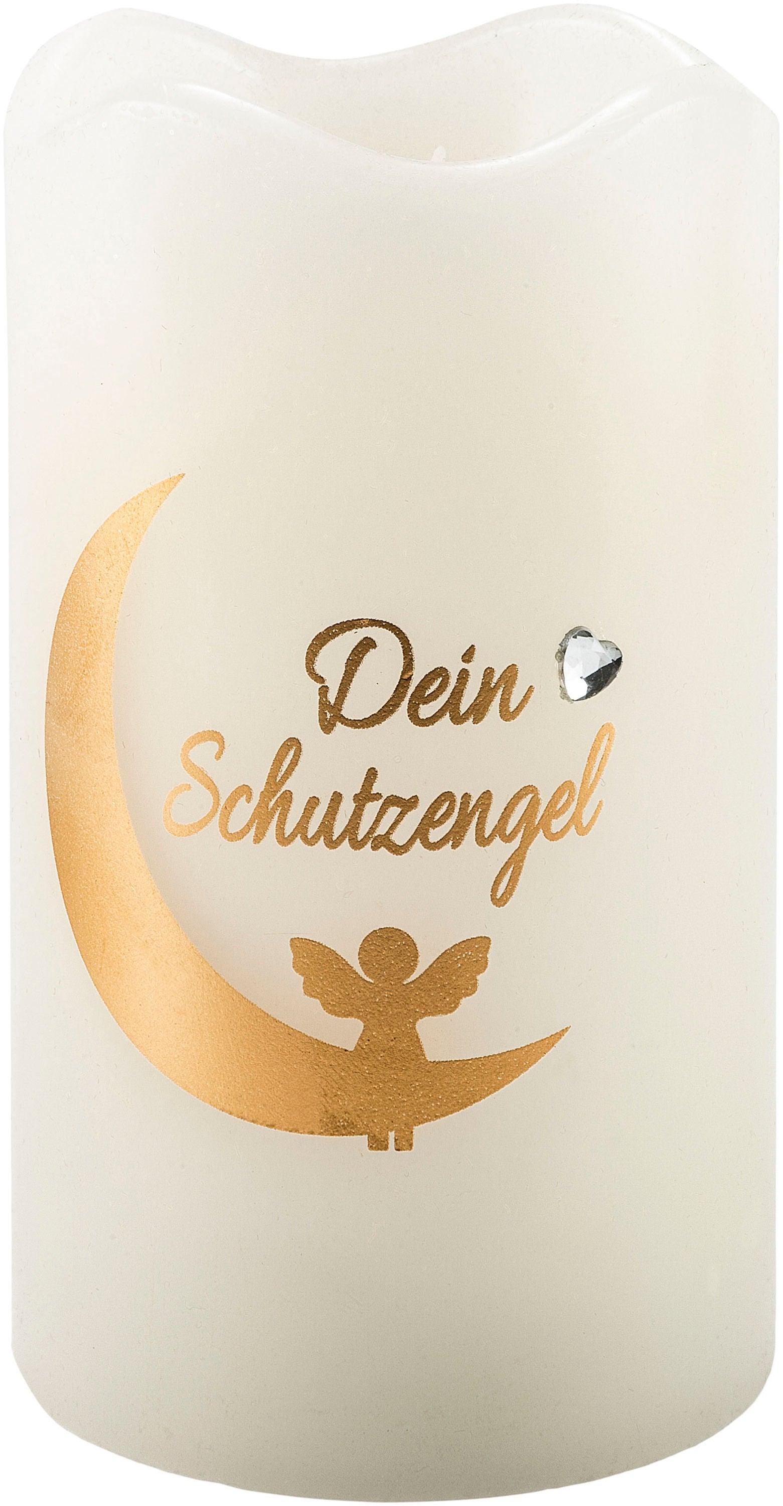 Mit dem Geschenkset LED-Echtwachskerze „Dein Schutzengel“ zeigen Sie Ihrer Familie und lieben Freunden, dass Sie ihnen nur das Beste wünschen. LED-Kerze aus Echtwachs mit goldener Schutzengel-Aufschrift, Engel und Mond. Dazu ein Kunst-Kristall als Herz. Mit warm-weißer LED und realistischem Flackerlicht. Für 2 x AAA Batterien ( nicht enthalten). Inkl. Grußkarte mit der Aufschrift "Dein Schutzengel" und auf der Rückseite Platz für eine kleine persönliche Widmung. Kerze und Karte zusammen in edler Geschenkbox. Kerze Ø 7 cm, Höhe 12 cm.
