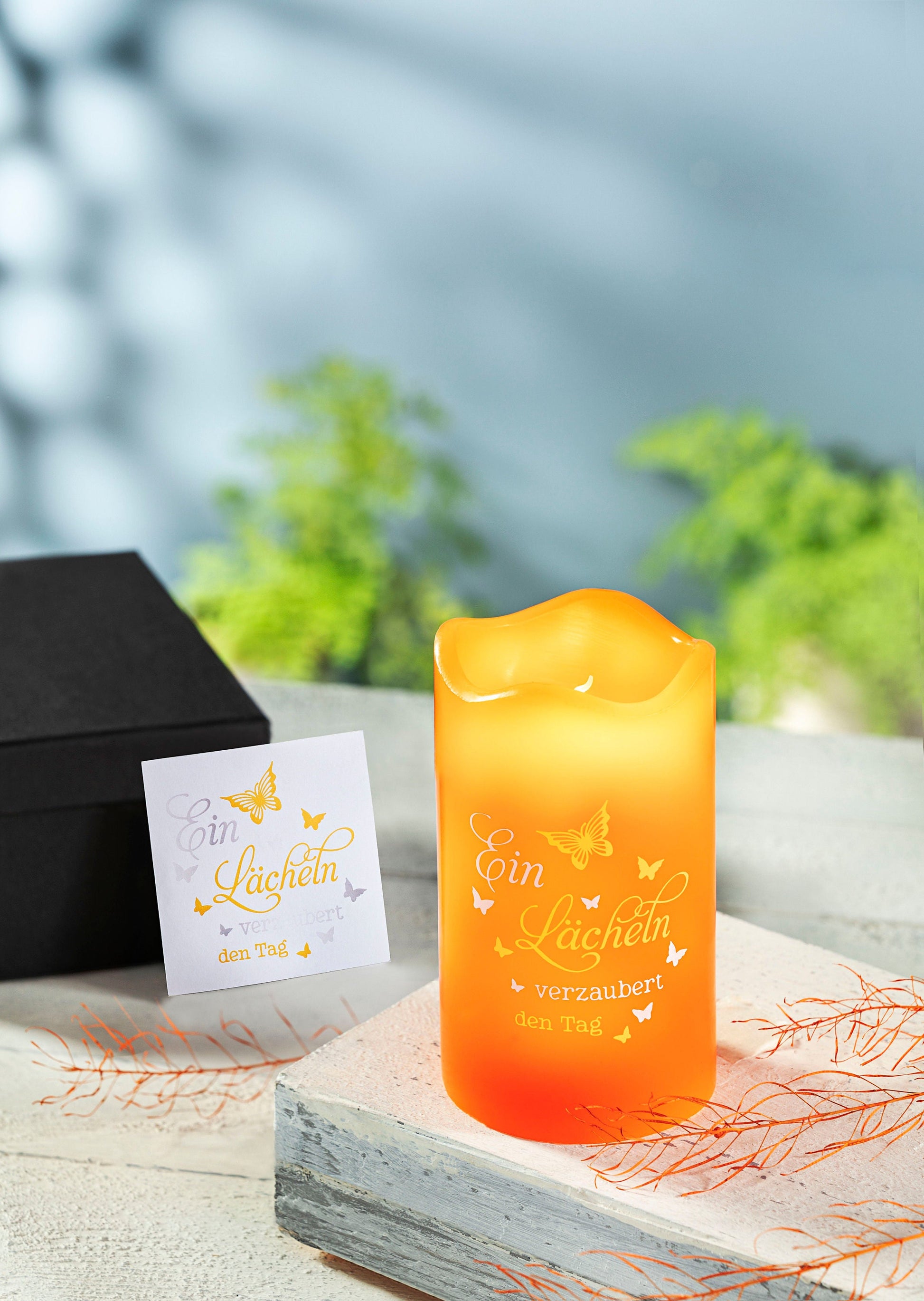 In strahlendem Orange und mit aufgedruckten Schmetterlingen verbreitet diese LED-Echtwachskerze "Lächeln" Leichtigkeit und fröhliche Stimmung. Perfekt als aufmunterndes Geschenk oder um sich selbst zu erfreuen.