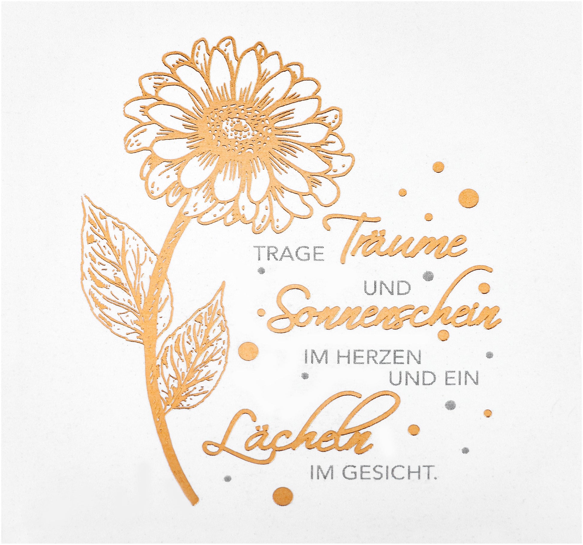 Für Lieblingsmenschen, denen Sie nur das Beste wünschen: „Trage Träume und Sonnenschein im Herzen und ein Lächeln im Gesicht“. Eine bezaubernde Botschaft, die inmitten eines wunderbaren Dekors perfekt in Szene gesetzt wird. Die ausdrucksstarke Blume und verspielte Pünktchen geben dem Spruch einen passenden Rahmen.