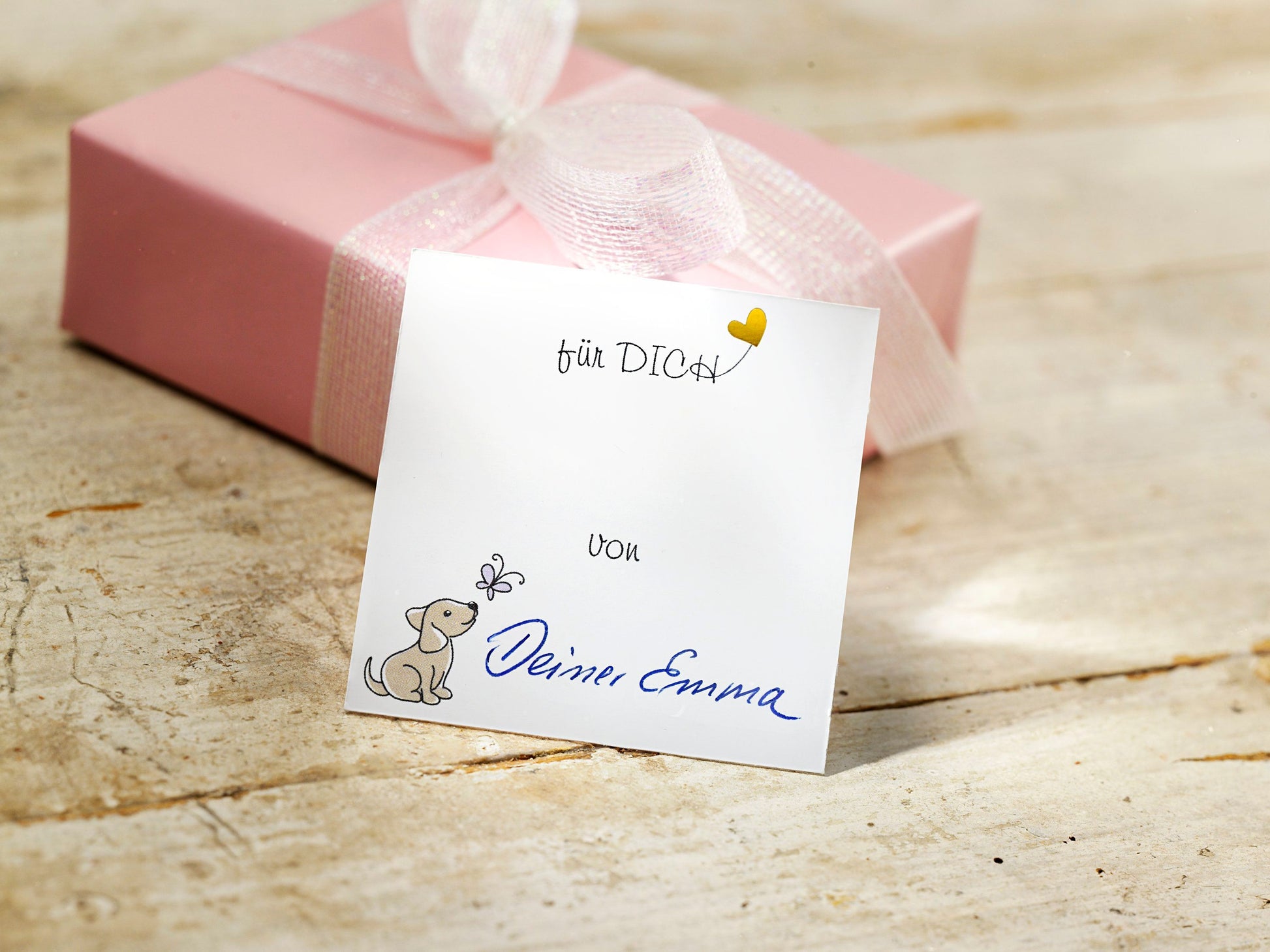 Der Clou: Zum Überreichen enthält das Set ein hübsches Kärtchen, teils mit goldfarbenem Print. Auf der Rückseite ist Platz für Ihre Widmung. Die Vorderseite glänzt mit einem goldglänzenden Herz und dem Sinnspruch „Ein Hund ist ein Herz auf vier Pfoten“.