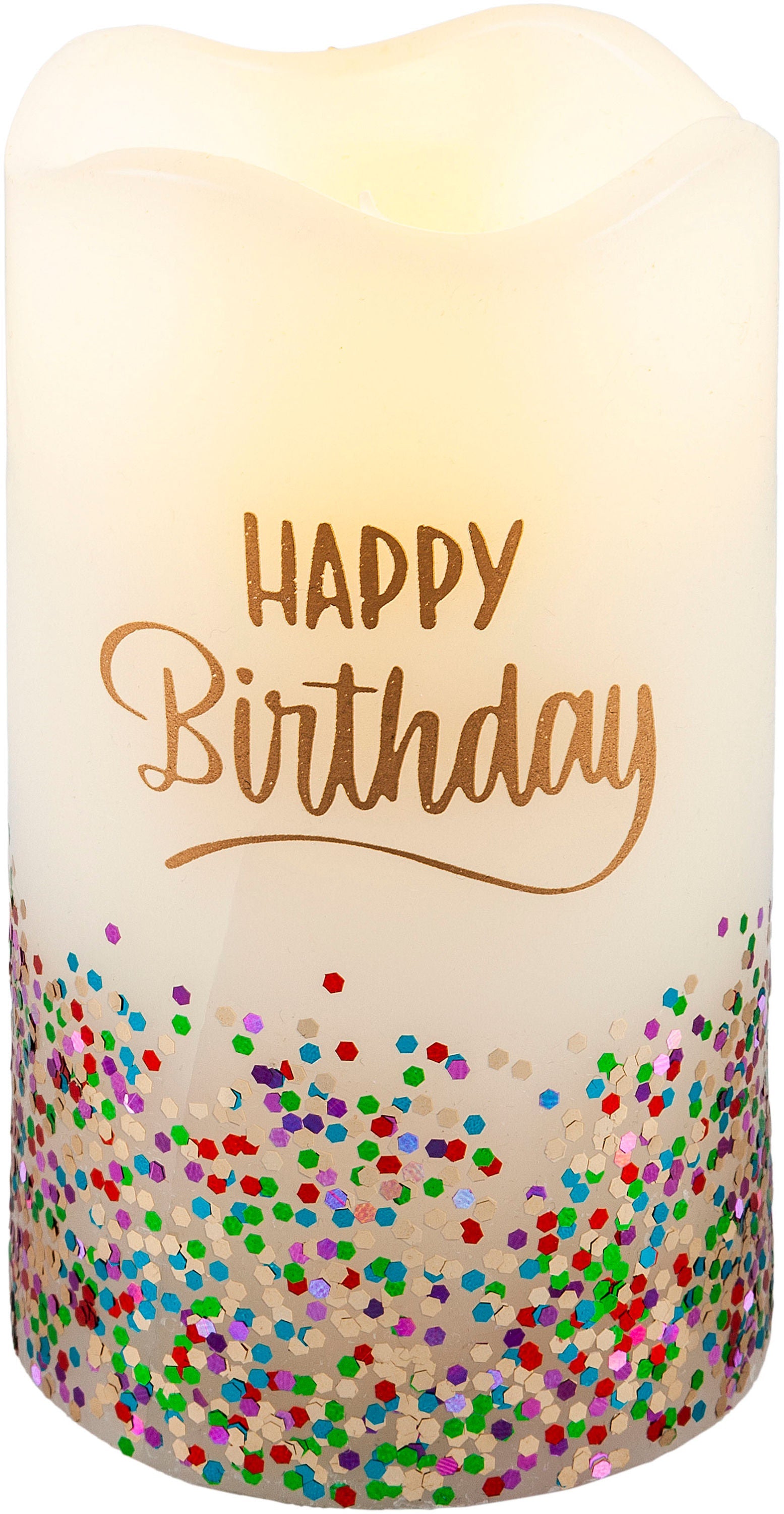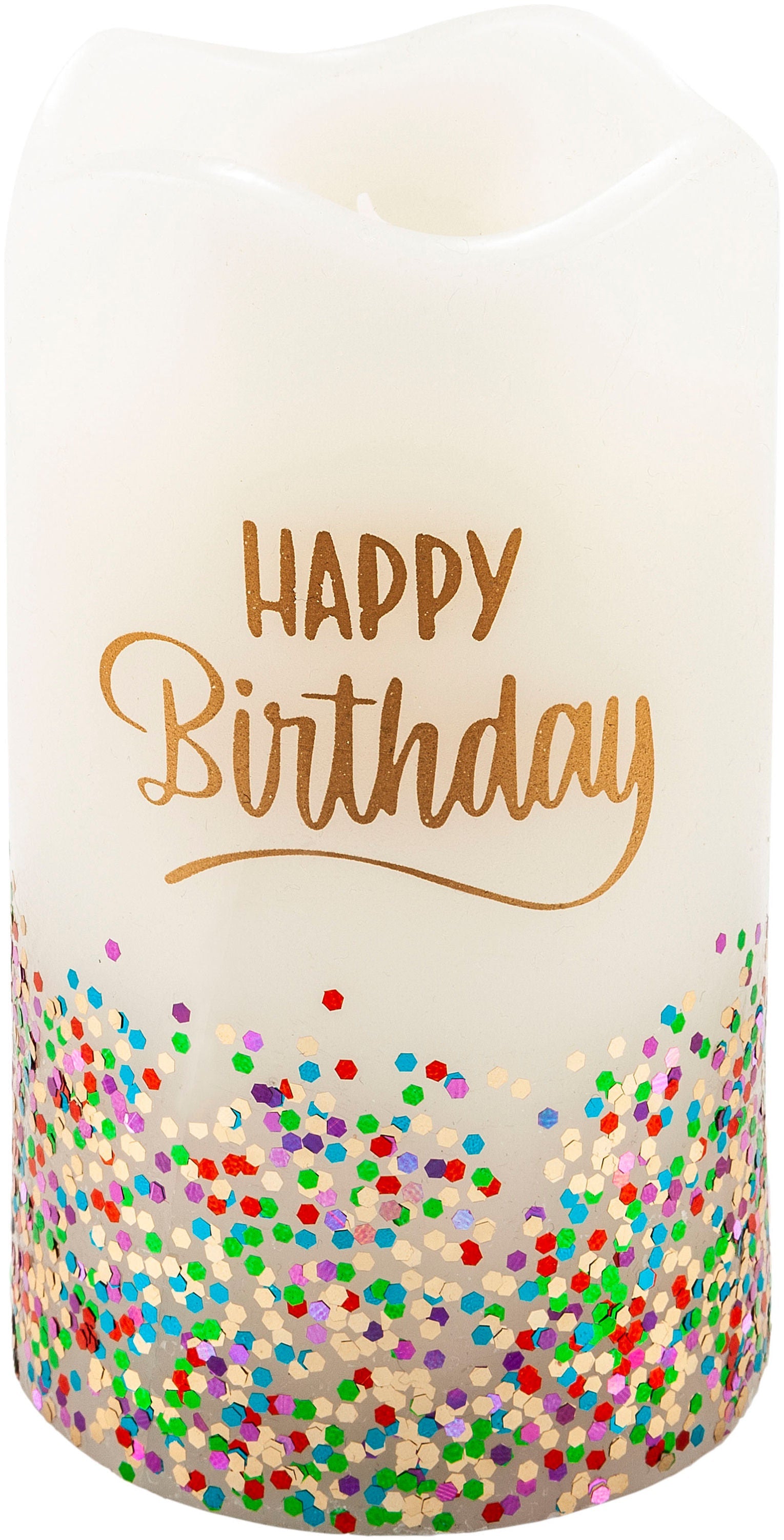 „Happy Birthday“ und das nötige bisschen Glitzer, das wir alle im Leben brauchen – dieses Geschenkset überbringt Ihre Geburtstagsgrüße auf glanzvolle Art! Auf der cremeweißen LED-Echtwachskerze mit gewelltem Rand glänzen der goldfarbene Schmuckschriftzug „Happy Birthday“ und bunte Glitzerkonfetti um die Wette. Die warmweiße LED-Flamme lässt die Kerze wunderbar sanft erstrahlen, sodass die Konfettipunkte noch mehr Funkelzauber mitbringen. Ob auf der Festtafel oder Auch nach dem Geburtstag im Regal sehr dekorativ: Der 6-Stunden-Timer lässt die Kerze stets zu Ihrer Wunschzeit leuchten. Lichtstimmung mit Sicherheit Die cremeweiße Kerze ist dank LED-Technik absolut sicher, sauber und brennt nie ab.