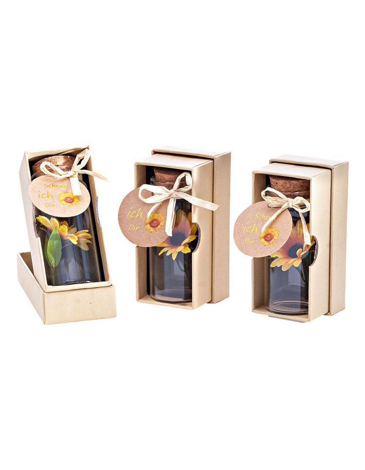 3 Gläser mit Sonnenblumen-Deko Höhe 8 cm Mit Geschenk-Anhänger Originelle Geschenkverpackung für Kleinigkeiten Je in einer extra Geschenkbox Fröhlicher Blumengruß: Geschenkset Sonnenblume im Glas , 3er-Set Die kleine Sonnenblume fällt sofort ins Auge. Ihr strahlendes Gelb verbreitet Fröhlichkeit und gute Laune. Positive Energie kann jeder gut gebrauchen! Sie ist sorgfältig untergebracht in einem Glas mit Korkenverschluss. Ein aufwendig gestalteter Geschenkanhänger mit Sonnenblumen-Motiv und goldglänzender Schrift rundet das Set perfekt ab. Mit dem Bastband können Sie ihn am Glas befestigen! Kleinigkeiten, hübsch verschenkt Für Geldgeschenke, Gutscheine, zarte Schmuckstücke oder einen kleinen Talisman ist das Geschenkset Sonnenblume im Glas , 3er-Set, perfekt geeignet! Sie können zusätzlich Seidenpapier oder Organzastoff ins Glas legen, damit Ihre Gabe nicht sofort zu erkennen ist. Zusammen mit der Sonnenblume können Sie sicher sein, dass dieses besondere Geschenk richtig gut ankommt! Aber auch einfach als Mitbringsel und kleines Dankeschön eignen sich die Gläser wunderbar. Nicht umsonst ist auf dem Anhänger ein guter Wunsch aufgedruckt: ... damit die Sonne immer für Dich scheint . Geschenkset Sonnenblume im Glas , 3er-Set 3 zylinderförmige Gläser (Höhe 8 cm, Ø 3,5 cm) mit Korkenverschluss je gefüllt mit einer Sonnenblume aus Kunststoff inkl. Anhänger mit Sonnenblumen-Motiv und Schrift im Gold-Print Bastband jedes Glas in eigener Geschenkbox Das Geschenkset Sonnenblume im Glas , 3er-Set, ist perfekt geeignet, um einen lieben Menschen mit einer Kleinigkeit zu überraschen. Bestellen Sie am besten gleich einen Vorrat, damit Sie sich immer für spontane Einladungen oder kleine Gefallen gleich bedanken können. Jetzt gleich in den Warenkorb legen und noch heute bei uns online kaufen!