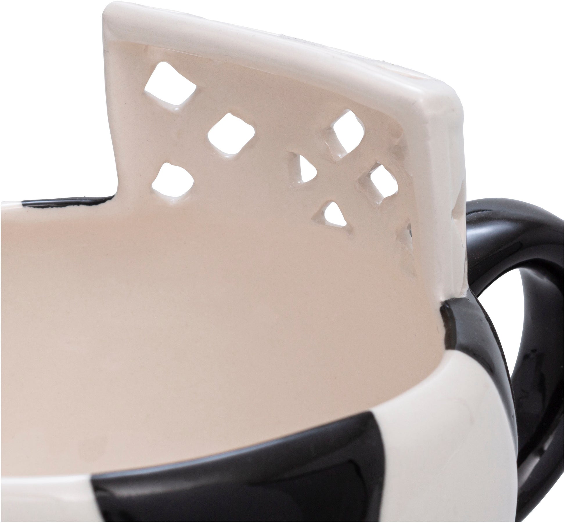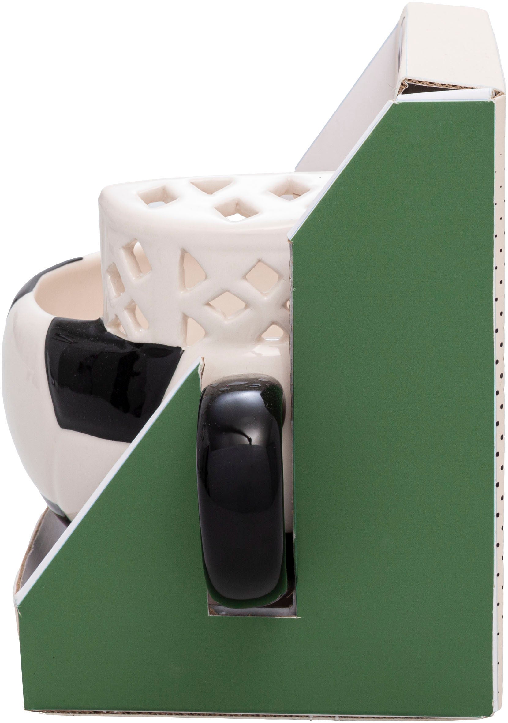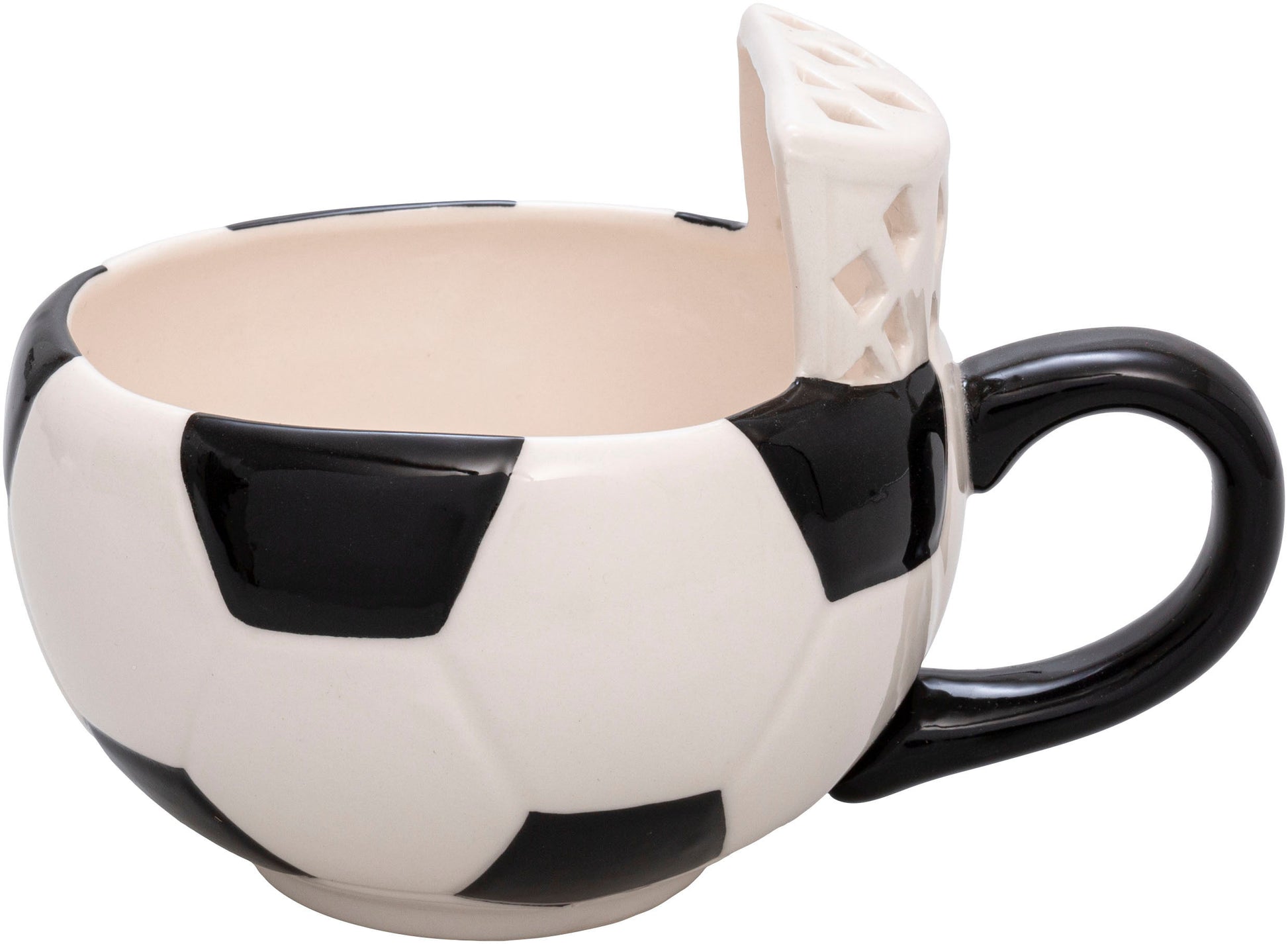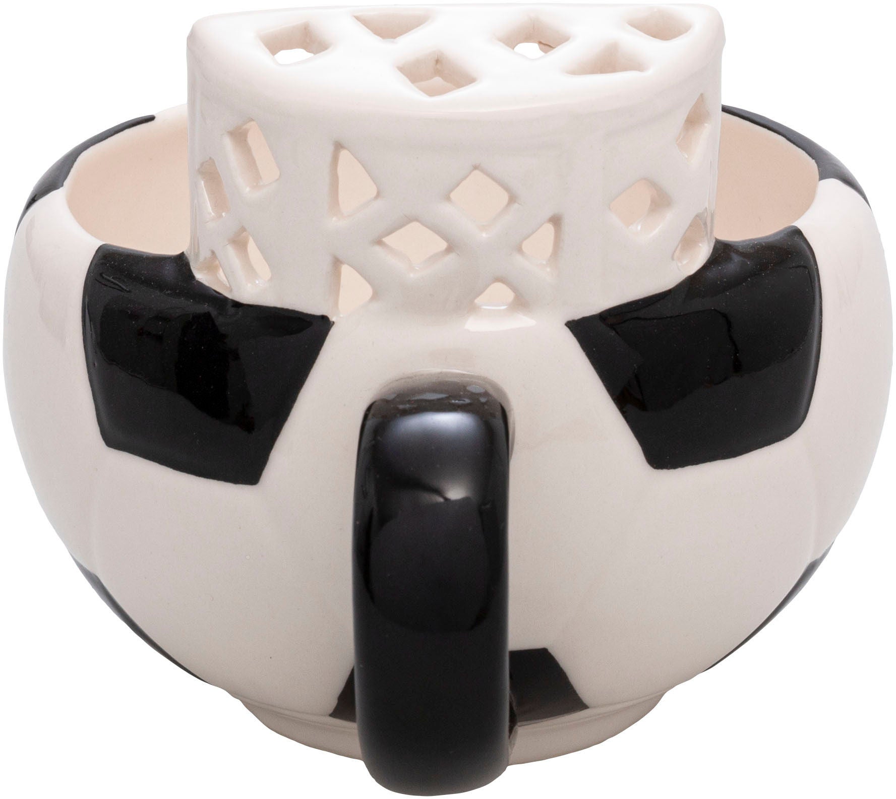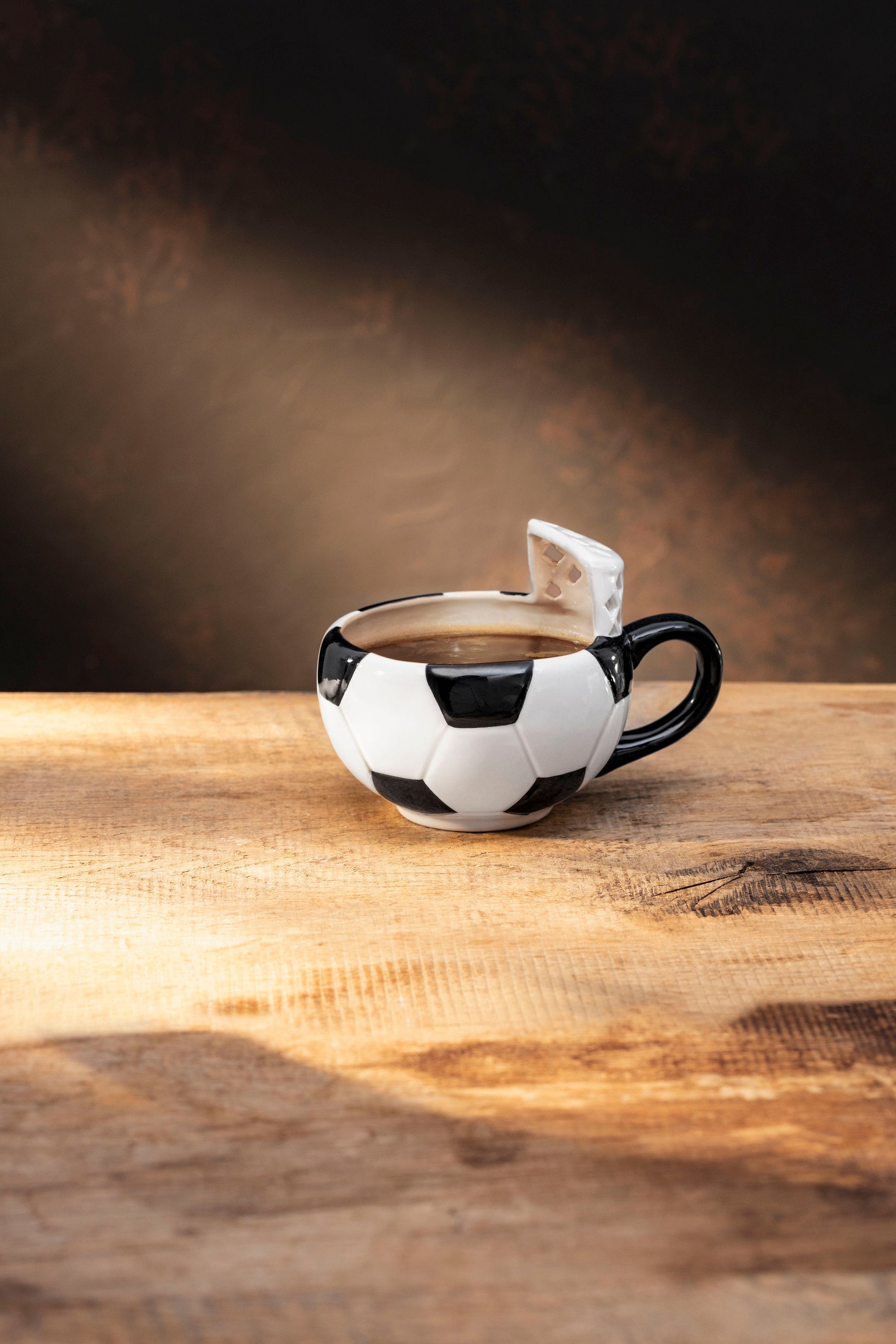 Die extra große Fußball-Tasse ist im klassischen Schwarz-weiß ihrem Vorbild ideal nachempfunden. Orginelles Detail: das kleine Tor am Tassenrand - damit zählt auch der frisch eingeschenkte Kaffee als Treffer, oder?