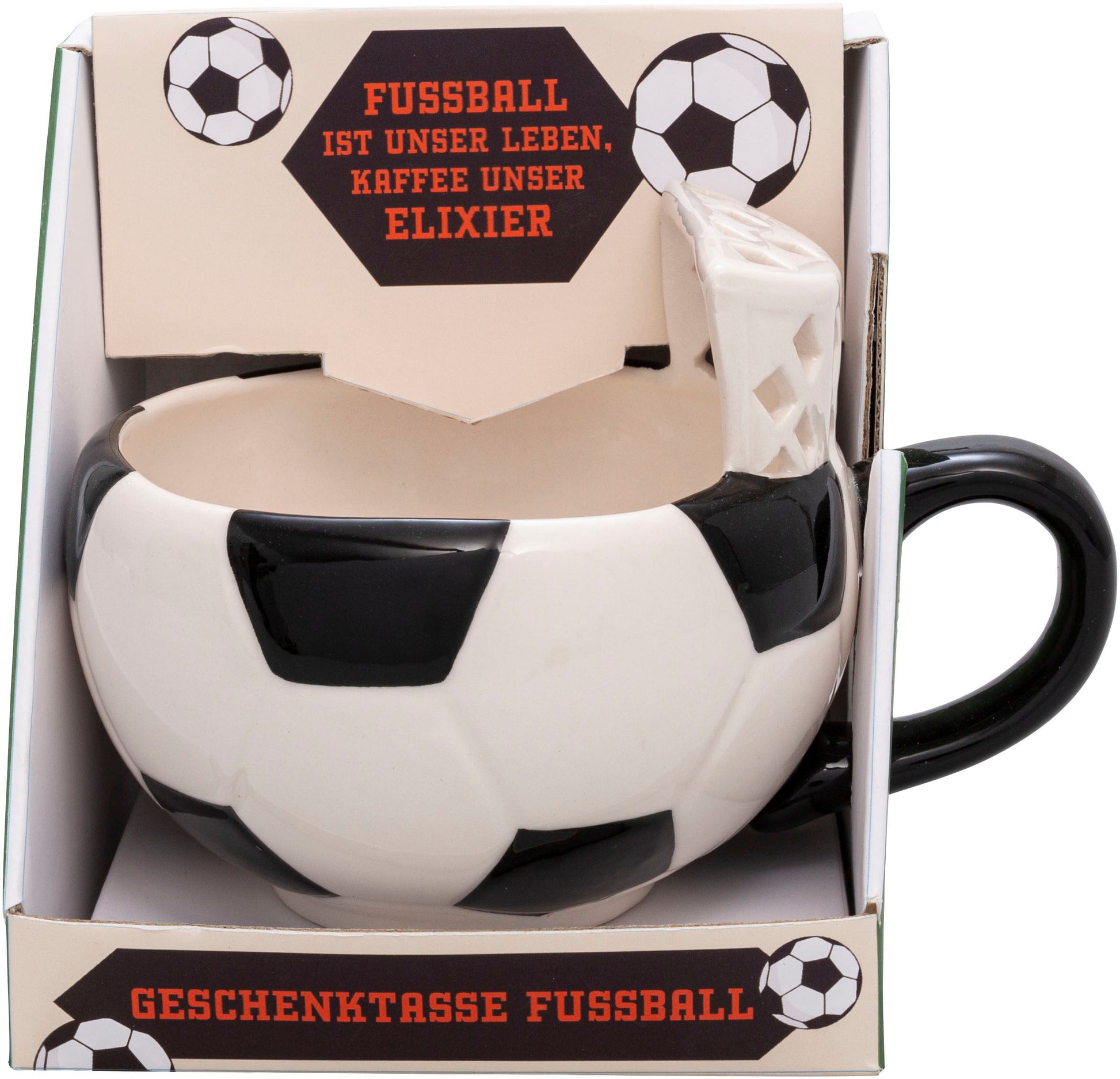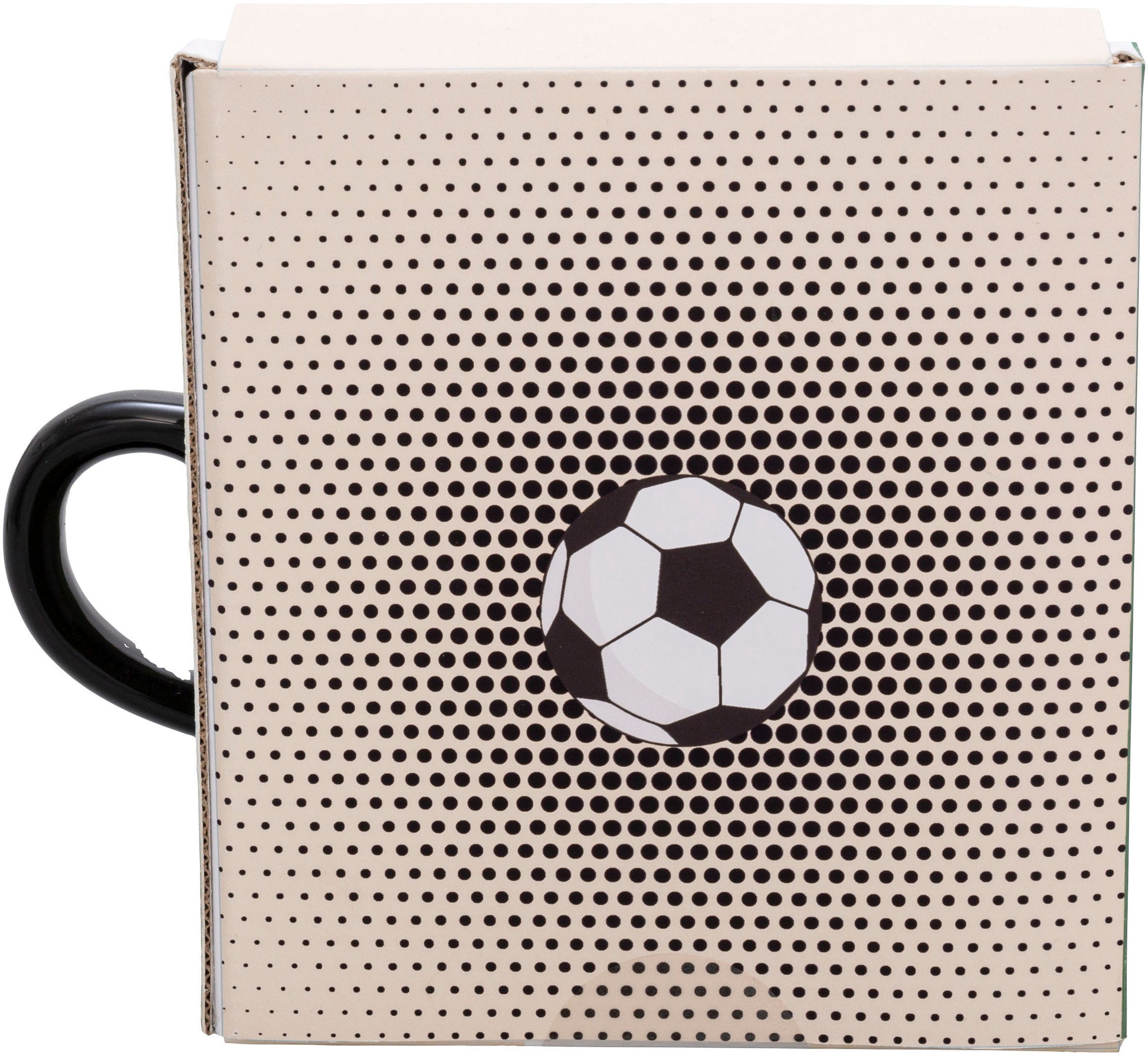 Anpfiff schon zum Frühstück! Mit der Geschenktasse "Fußball" kommt schon in aller Früh Stimmung auf. Mit einem Fassungsvermögen von 400 ml (randvoll sogar 480 ml) ist sie perfekt für eine extra große Portion Kaffee, Tee oder auch fürs Müsli geeignet.