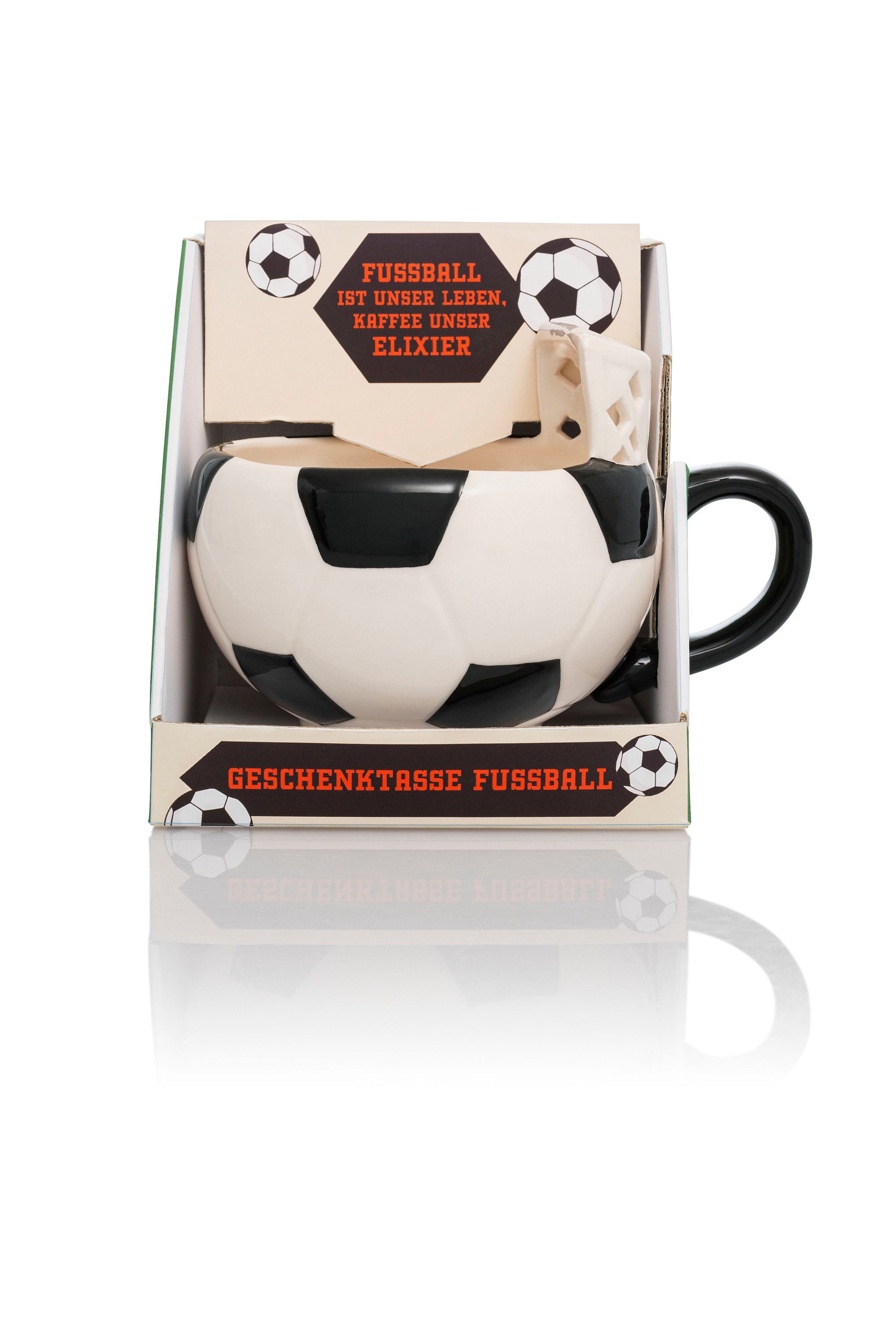 Die Geschenktasse "Fußball" ist geschützt in einer passend gestalteten Geschenkbox untergebracht, die mit dem richtigen Spruch für alle Fußball- UND Kaffee-Fans bedruckt ist: