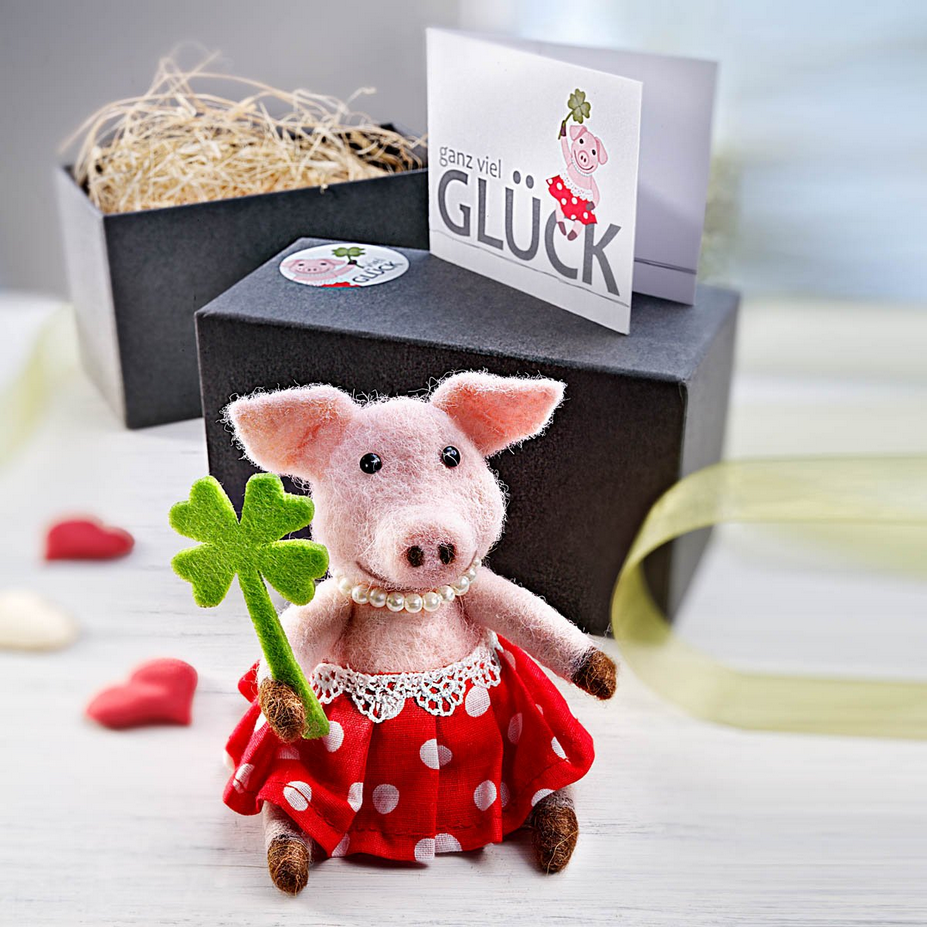 Das rosa Schweinchen "Louise" aus Filz mit Perlenkette und Rüschen am Rock mit einem vierblättrigen Glückskleeblatt. Ein niedliches Tierchen als Glücksbringer für einen Geburtstag oder als Geschenk zu Weihnachten unterm Baum. Ebenfalls enthalten ist eine Geschenkbox und eine Karte für eine persönliche Nachricht.