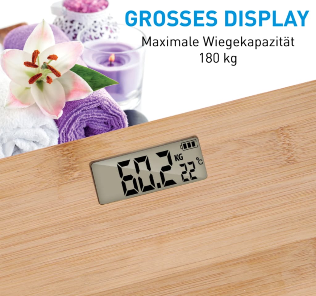 Dank ihrer kompakten Abmessungen benötigt die digitale Personenwaage von Grundig wenig Platz und eignet sich daher ideal für kleinere Badezimmer. Die Körperwaage verfügt über ein LCD-Display zum einfachen Ablesen der Waage. Außerdem schaltet es sich automatisch ein, wenn Sie darauf treten. Dank ihres ultraflachen Designs ist die Digitalwaage äußerst sicher und lässt sich problemlos unter einem Schrank oder Regal verstauen. Features: - Kompakte, digitale Personenwaage aus Bambus - LCD-Bildschirm - Rutschfeste Füße Technische Daten: - Batteriebetrieben mit 2x Micro AAA-Batterien (im Set enthalten) - Messbereich: 100 g...180 kg - Material: Bambus, künstlicher Kunststoff - Bambusstärke: 12 mm - Einheiten: Kilogramm und Pfund - Farbe: braun - Maße (LxBxH): 280x280x30 mm Lieferumfang: - 1x Personenwaage - 2x AAA-Batterien - 1x Bedienungsanleitung.