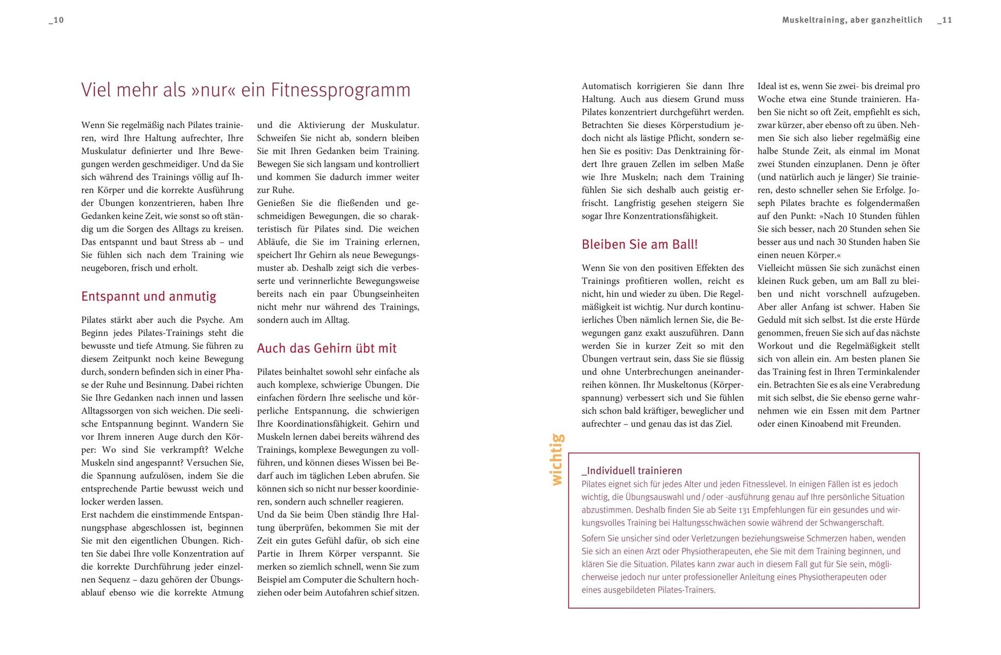 Mit diesem komplett aktualisierten Standardwerk können Frauen und Männer optimal nach der Pilates-Methode trainieren. Sie bekommen eine fundierte Einführung in das Training mit allen wichtigen Infos zu Philosophie, Trainingsgrundlagen und anatomischem Hintergrundwissen. Im Praxisteil werden die Original-Pilates-Übungen Schritt für Schritt genau erklärt; dazu gehören auch Tipps gegen typische Fehler, Übungsvarianten und beim Üben hilfreiche Visualisierungen. Trainingsempfehlungen für Menschen mit viel oder wenig Zeit, bei Rückenproblemen und in der Schwangerschaft runden den Übungsteil ab. Drei maßgeschneiderte Übungsprogramme für Einsteiger, Fortgeschrittene oder Super-Fortgeschrittene motivieren zum direkten Einstieg ins Training. Kein Konkurrenztitel kann mit dieser Fülle an Informationen und praktischen Anregungen mithalten.