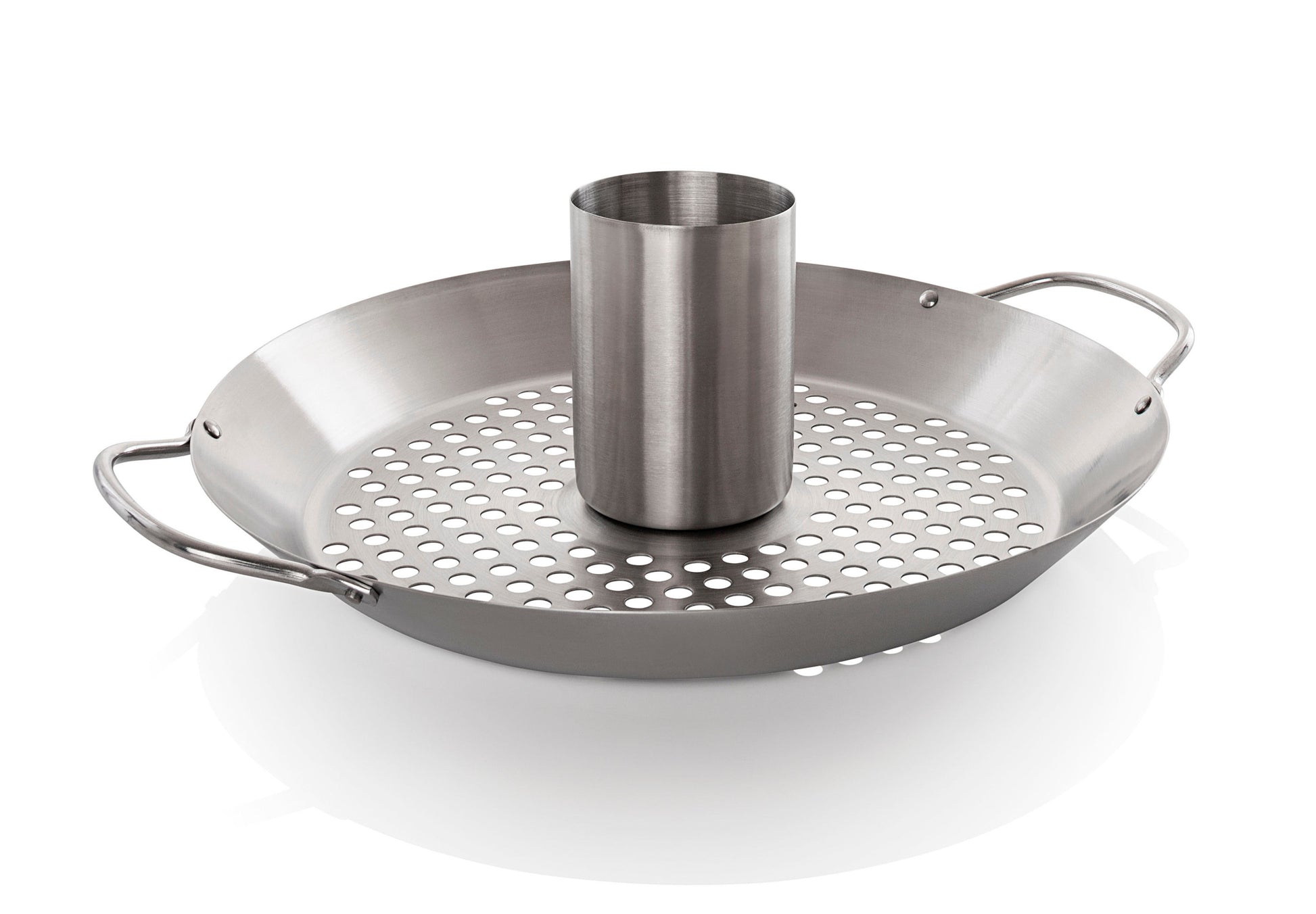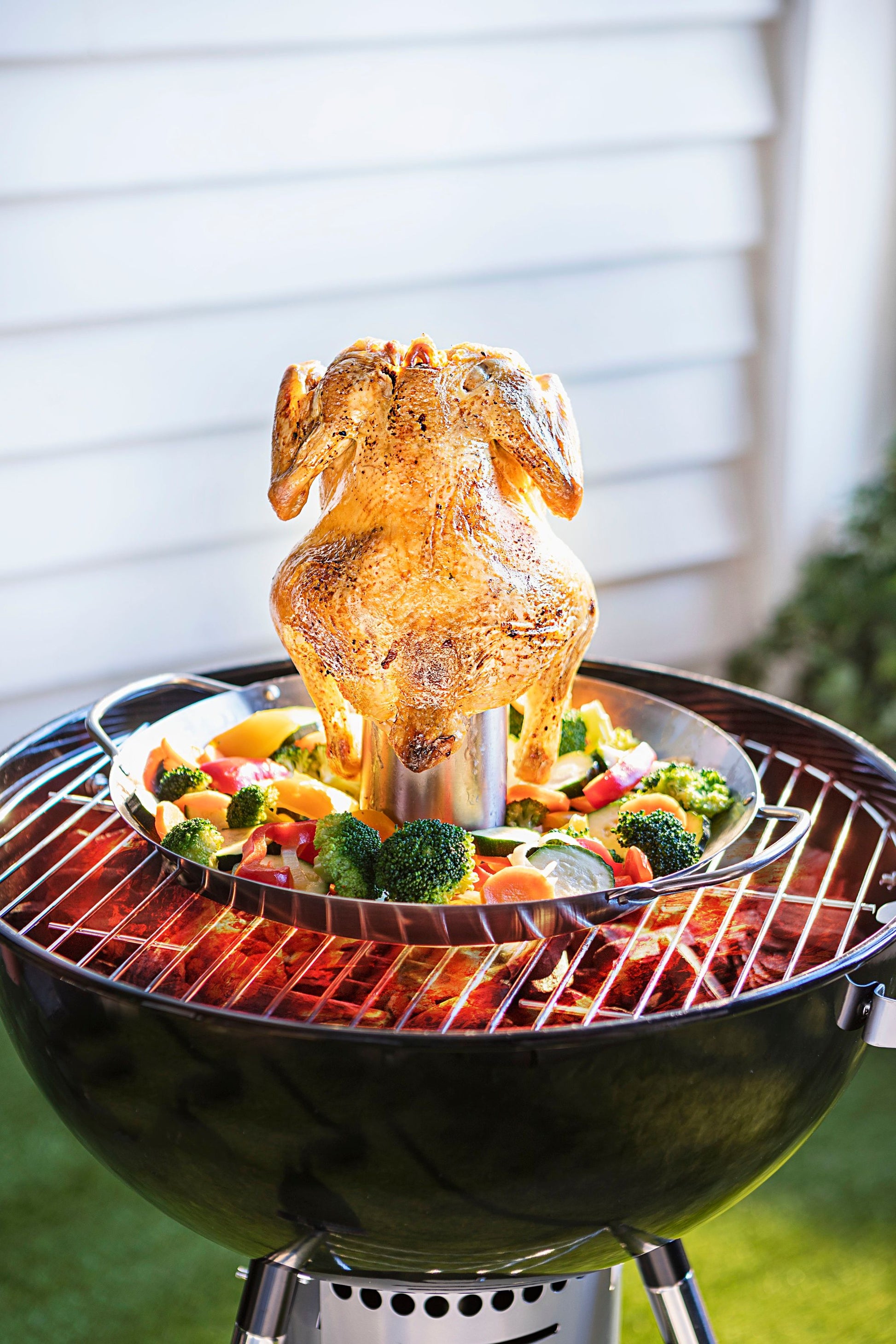 Der Hähnchenbräter bringt Hühnchen & Co. in die optimale Bratposition: einfach das Hähnchen in der Mitte aufsetzen - so wird es rundum schön knusprig, denn überschüssiges Fett tropft einfach ab. So sparen Sie sich gleichzeitig überflüssiges Fett. In der unteren, gelochten Schale können Sie gleichzeitig Gemüse mitgaren.