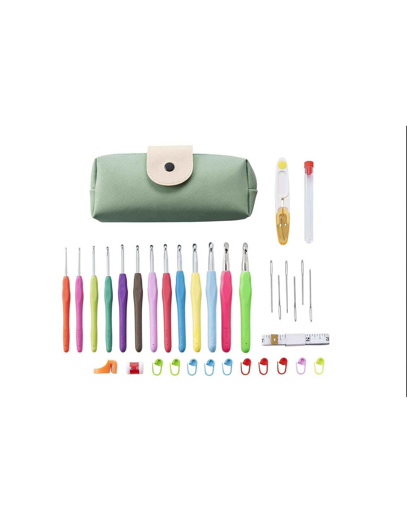 Das Häkelset enthält: 14 Häkelnadeln in verschiedenen Größen von 2,2 bis 10 mm aus Aluminium mit Griffen aus weichem Gummi (Länge je 14 cm), 1 Maßband (150 cm), 6 Nadeln, 1 Fadenschneidering, 1 Reihenzähler, 10 Maschenmarkierer, 1 Schere. Alles ist in einer Aufbewahrungstasche aus Kunstleder verstaut. Abmessungen: 18,5 x 7 x 3,5 cm.