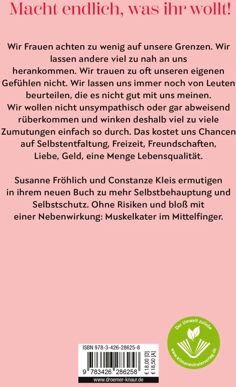 Ja, wir Frauen können wählen: Entweder still und meist vergeblich auf Respekt, Verständnis und Lastenausgleich hoffen. Oder beanspruchen, was uns zusteht. Klar, da gibt es immer noch einige innere und äussere Widerstände zu überwinden. Kein Problem mit dem emotionalen Superfood für die weibliche Selbstbehauptung, das Susanne Fröhlich und Constanze Kleis mit ihrem neuen Buch abliefern. Selbstverständlich mit dem Mittelfinger geschrieben.