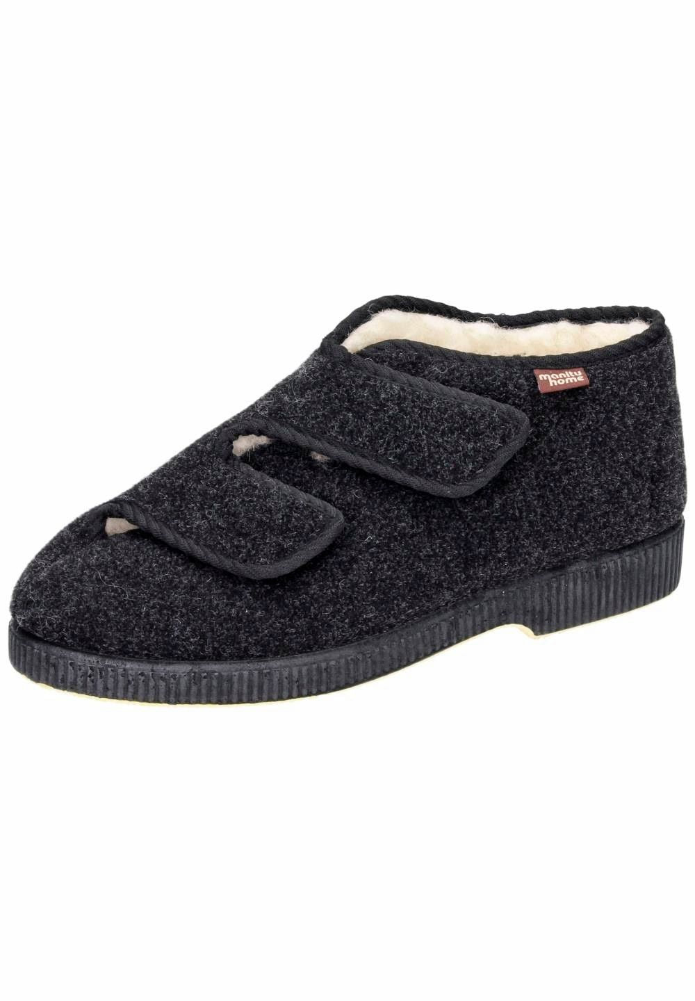 Angenehm warme und atmungsaktive Hausschuhe, mit denen Sie auch bequem auf der Strasse laufen können. Weit zu öffnen durch 2 Klettverschlüsse. PVC-Sohle, Innen: Schurwollfutter, Obermaterial: Wollfilz, Decksohle aus Wolle.