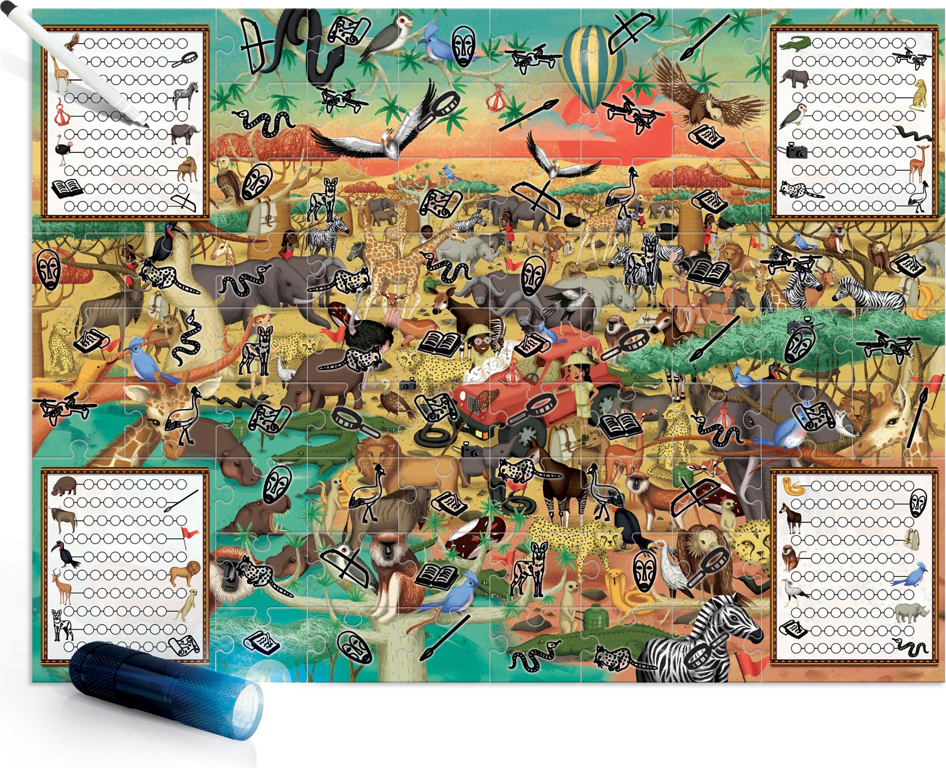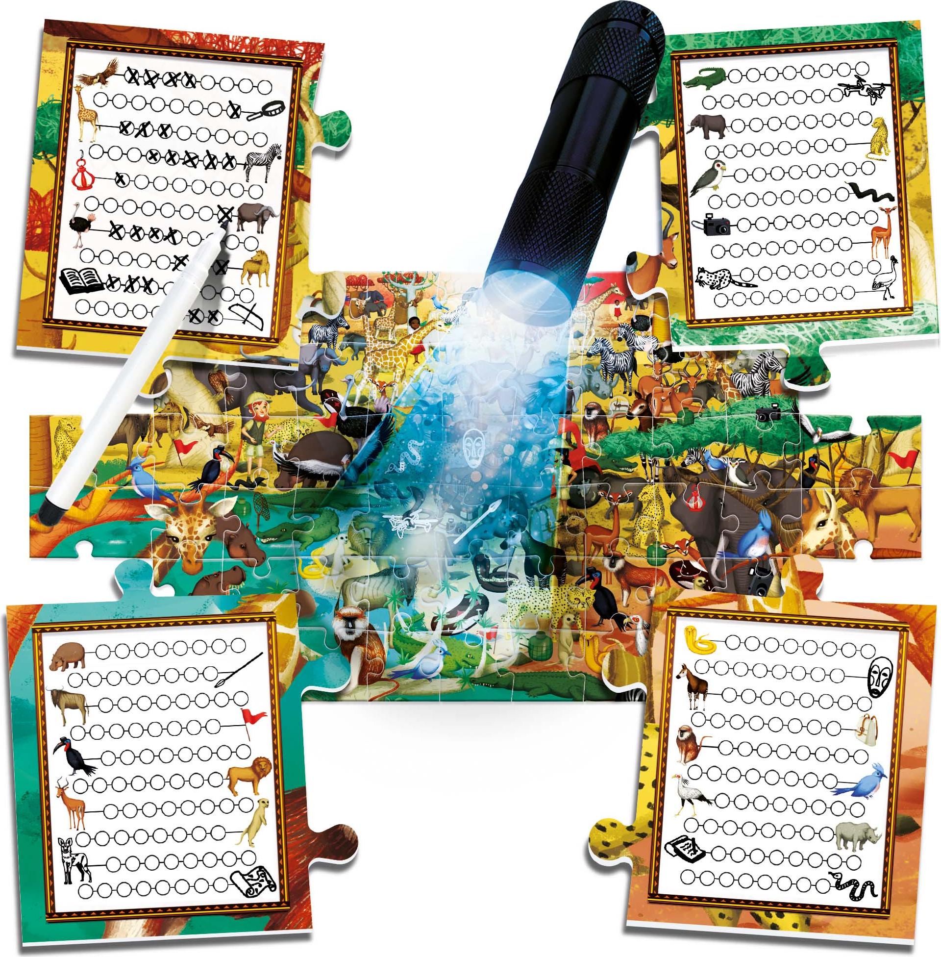 Explore the Safari -Wissenschaftliches Denken von klein auf anregen. Setze das Puzzle zusammen und erkunde die Bewohner der Savanne. Notiere deine Entdeckungen wie ein echter Wissenschaftler im Notizheft. Mit der magischen Taschenlampe kannst du Dinge erkennen, die mit blossem Auge nicht zu sehen sind.