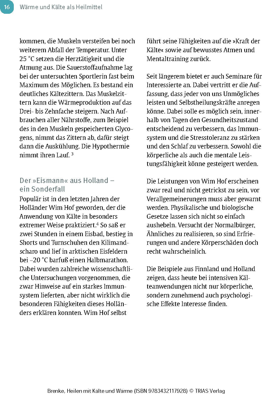 Es müssen nicht immer Medikamente sein! Neueste Forschungsergebnisse zeigen, dass sich viele Beschwerden auf natürliche Weise behandeln lassen: Hydro- und Kryotherapie, also der Einsatz von Wasser und Kälte, hemmen gefährliche Entzündungen, die für Krankheiten wie Rheuma, Arthrose oder sogar für Depressionen verantwortlich sind. Sowohl Warm- als auch Kaltreize wirken positiv auf Muskelspannung und Durchblutung, aber auch auf Herz-Kreislauf-Erkrankungen, und sind beide erfolgreich in der Schmerztherapie. Effekte zeigen sich nach kurzer Zeit: ein stärkeres Immunsystem mit weniger grippalen Infekten, stabilerer Kreislauf, bessere Stimmung und vor allem weniger Schmerzen.