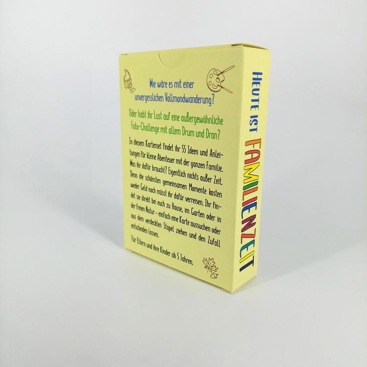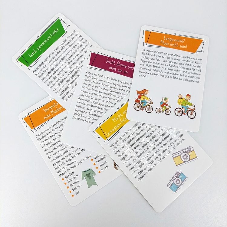 Wie wäre es mit einer unvergesslichen Vollmondwanderung? Oder habt ihr Lust auf eine außergewöhnliche Foto-Challenge mit allem Drum und Dran? In diesem Kartenset findet ihr 55 Ideen und Anleitungen für kleine Abenteuer mit der ganzen Familie. Was ihr dafür braucht? Eigentlich nichts außer Zeit. Denn die schönsten gemeinsamen Momente kosten weder Geld noch müsst ihr dafür verreisen. Ihr findet sie direkt bei euch zu Hause, im Garten oder in der freien Natur – einfach eine Karte aussuchen oder aus dem verdeckten Stapel ziehen und den Zufall entscheiden lassen. Für Eltern und ihre Kinder ab 5 Jahren.