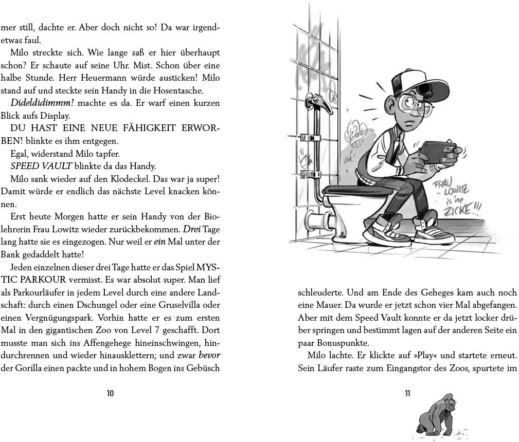 Virtual Reality für Kids - ein Buch so spannend wie ein ComputerspielSitzt da wirklich ein waschechter Gorilla im Lehrerzimmer? Eigentlich war Milo nur kurz auf dem Klo (okay, vielleicht hat er auch ein ganz kleines bisschen auf seinem Handy gedaddelt) und als er wieder zurück ins Klassenzimmer will, ist das gesamte Schulgebäude evakuiert. Schnell stellt sich heraus: der Gorilla ist seine zickige Biolehrerin Frau Lowitz. Sein Handyspiel besitzt offensichtlich eine geheime Zusatzfunktion und jetzt steckt Milos Lehrerin im Körper des Riesengorillas aus Level 7 fest! Klar, dass er Frau Lowitz helfen muss, ihre Lehrerinnengestalt zurückzuerlangen! Nur wie? Die regelwütige Lehrerin und der clevere, sich nicht immer so ganz an die Regeln haltende Milo werden zu einem schrägen Team. Gemeinsam mit Milos besten Freunden Artan und Helene finden sie den Spieleentwickler und kommen seinem fiesen Plan auf die Spur!