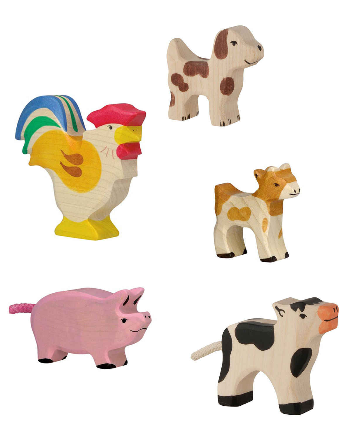Mit den kleinen Holztieren Hahn, Kuh, Ziege, Schwein und Hund können Kinder fantasievolle Geschichten erfinden oder Abenteuer aus dem letzten Urlaub auf dem Bauernhof nachspielen. Die per Hand gefertigten Spielfiguren bieten auch eine prima Ergänzung für die Spielzeugfarm. Die niedlichen Bauernhof-Tiere sind aus Massivholz gefertigt und dank abgerundeter Kanten gut von Kinderhänden zu greifen (Hahn ca 8,5 cm gross).