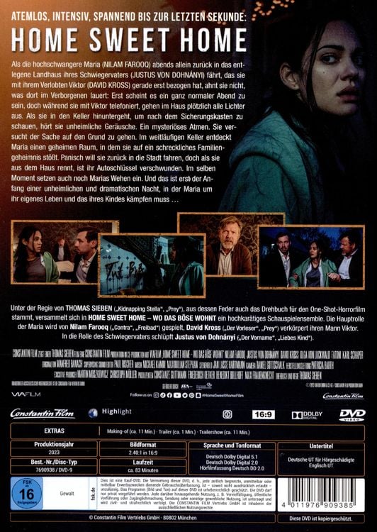 ATEMLOS, INTENSIV, SPANNEND BIS ZUR LETZTEN SEKUNDE:Als die hochschwangere Maria (Nilam Farooq) abends allein zurück in das entlegene Landhaus ihres Schwiegervaters (Justus von Dohnányi) fährt, das sie mit ihrem Verlobten Viktor (David Kross) gerade erst bezogen hat, ahnt sie nicht, was dort im Verborgenen lauert: Erst scheint es ein ganz normaler Abend zu sein, doch während sie mit Viktor telefoniert, gehen im Hausplötzlich alle Lichter aus. Als sie in den Keller hinuntergeht, um nach dem Sicherungskasten zu schauen, hört sie unheimliche Geräusche. Ein mysteriöses Atmen. Sie versucht der Sache auf den Grund zu gehen. Im weitläufigen Keller entdeckt Maria einen geheimen Raum, in dem sie auf ein schreckliches Familiengeheimnis stößt. Panisch will sie zurück in die Stadt fahren, doch als sie aus dem Haus rennt, ist ihr Autoschlüssel verschwunden. Im selben Moment setzen auch noch Marias Wehen ein. Und das ist erst der Anfang einer unheimlichen und dramatischen Nacht, in der Maria um ihr eigenes Leben und das ihres Kindes kämpfen muss …Unter der Regie von THOMAS SIEBEN ("Kidnapping Stella", "Prey"), aus dessen Feder auch das Drehbuch für den One-Shot-Horrorfilm stammt, versammelt sich in "Home Sweet Home - Wo das Böse wohnt" ein hochkarätiges Schauspielensemble. Die Hauptrolle der Maria wird von Nilam Farooq ("Contra", "Freibad") gespielt, David Kross ("Der Vorleser", "Prey") verkörpert ihren Mann Viktor. In die Rolle des Schwiegervaters schlüpft...
