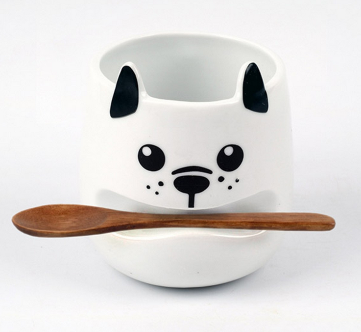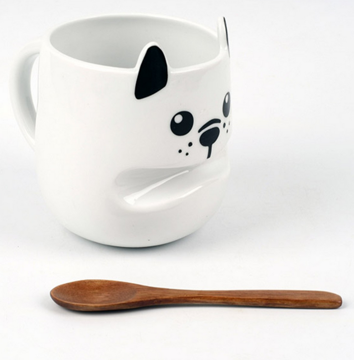 Der Becher zeigt sich in Form eines Hundes, der den hölzernen Kaffeelöffel wie ein Stöckchen quer im Mund trägt.