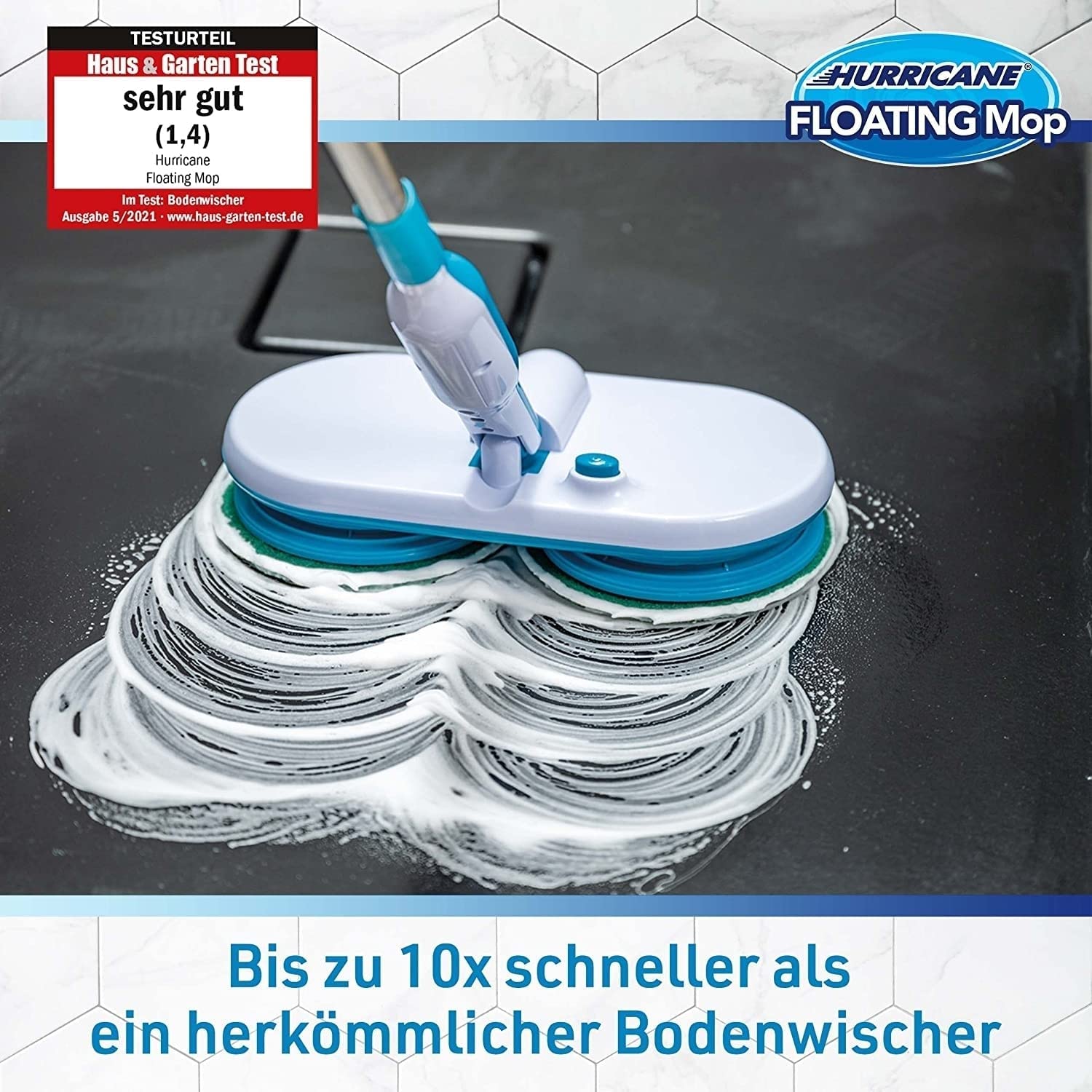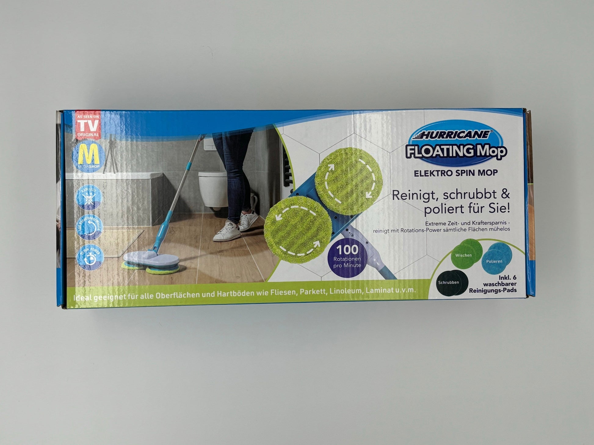 Hurricane Floating Mop - elektrischer Spin Mopp zum Wischen, Schrubben Polieren. Das Originial aus dem TV. Mit dem Akku Bodenwischer Hurricane Floating Mop ist Boden Wischen so schnell und einfach wie noch nie. Die rotierenden Moppköpfe reinigen die Bäden mit 100 U/min wie von selbst. Mit den speziellen Mikrofaser Tüchern ist der Floating Mop jeder Herausforderung gewachsen. Das weiche Pad nimmt den Schmutz dabei zuverlässig auf und schliesst ihn sicher ein. Das Scheuer-Pad schafft auch eingetrockneten und hartnäckigen Schmutz und das Polier-Pad sorgt für neuen Glanz. Dank seines leichten Designs und kraftvollen Antriebs lässt sich der Parkettwischer mühelos bedienen. Der Schwenkkopf putzt flexibel um jedes Hindernis herum und erlaubt auch eine Reinigung an vertikalen Flächen, etwa Stufen oder Sockelleisten. Der Wischer ist für alle harten Oberflächen geeignet egal, ob Keramik oder Marmor, Holzbäden, Laminat oder Vinylbäden und reinigt dabei bis zu 10x schneller als ein gewöhnlicher Wischmopp. Die Produktvorteile im Überblick: Müheloses Wischen dank Rotations-Power Kabellos, leicht, wendig, 90 Min Akkulaufzeit. Bis zu 10x schneller Wischen. Masse LxBxH: 31 x 15 x 123 cm Inkl. Spezial-Mikrofaser Pads. Lieferumfang: 1x Hurricane Floating Mop, je 2x Mikrofaserpad, Scheuerpad, Polierpad, 1x Ladekabel.