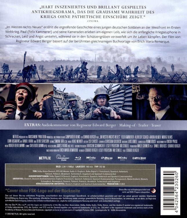 Im Westen nichts Neues erzählt die ergreifende Geschichte eines jungen deutschen Soldaten an der Westfront im Ersten Weltkrieg. Paul (Felix Kammerer) und seine Kameraden erleben am eigenen Leib, wie sich die anfängliche Kriegseuphorie in Schrecken, Leid und Angst umkehrt, während sie in den Schützengräben verzweifelt um ihr Leben kämpfen. Der Film von Regisseur Edward Berger basiert auf der berühmten gleichnamigen Buchvorlage von Erich Maria Remarque. Presse: - "Hart inszeniertes und brillant gespieltes Antikriegsdrama, das die grausame Wahrheit des Kriegs ohne pathetische Einschübe zeigt" - (CINEMA) - "Ein wuchtiges Requiem" - (DER SPIEGEL) - "Eine inszenatorisch starke, mitreißende und dramatische Neuverfilmung eines absoluten Literatur und Kino Klassikers" - (FILMSTARTS.de) - "Ein gewaltiges, grauenhaft aktuelles Schlachtengemälde" - (FOCUS) - "Einer der besten Antikriegsfilme aller Zeiten" - (awardsdaily.com)