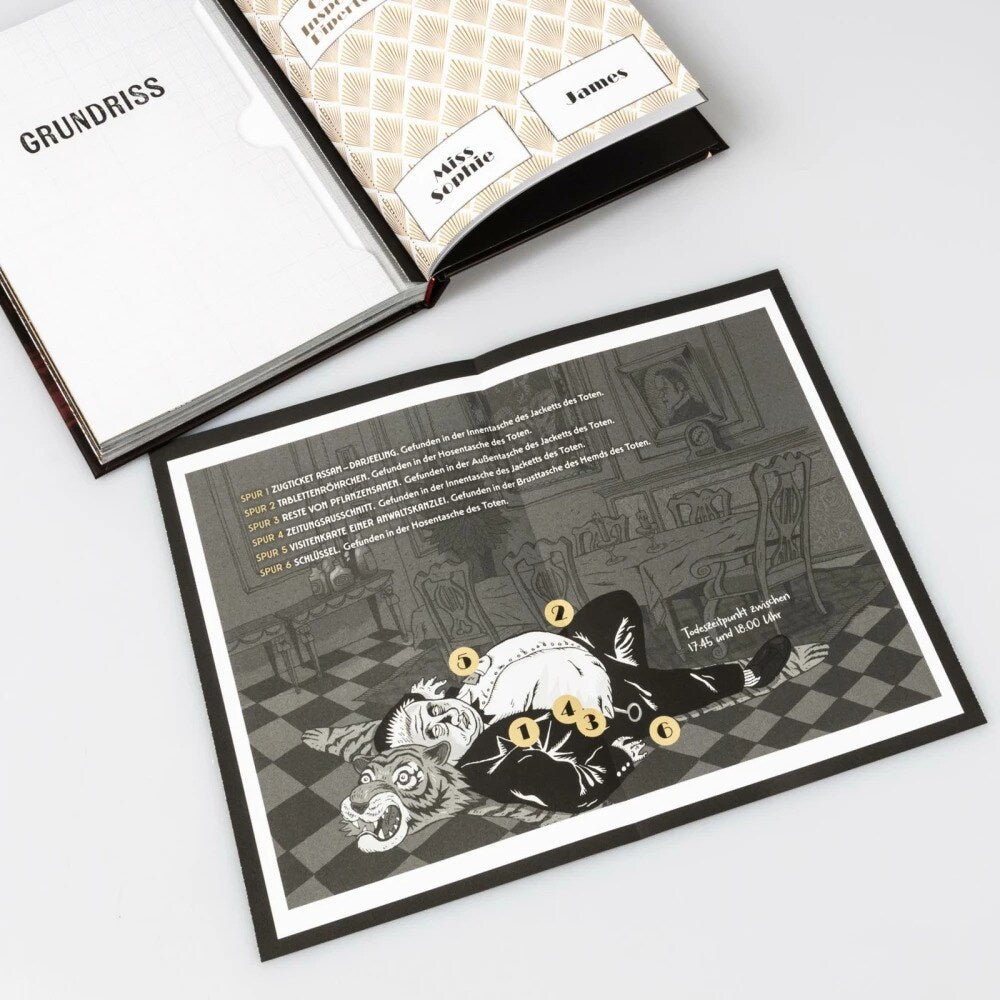 Krimi Dinner-Spiel in Buchform. Geschlossene, perforierte Seiten und QR-Codes im Inhalt.