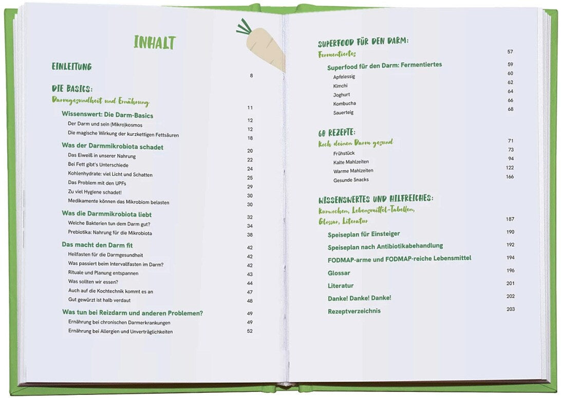 Spezielle Darm-Superfoods werden vorgestellt und in Tabellen wird gezeigt, wie wir unsere Ernährung bei Unverträglichkeiten oder Reizdarm geschickt umstellen können.