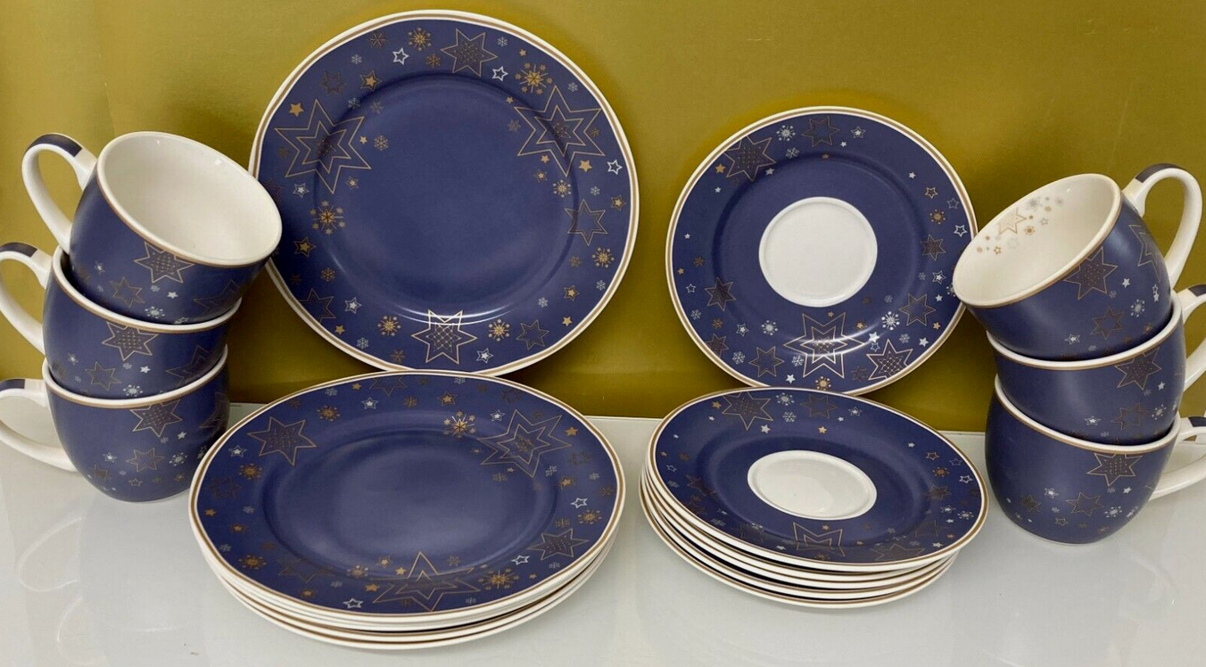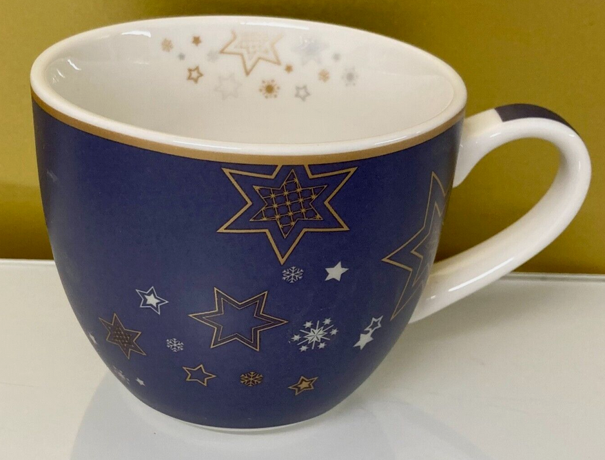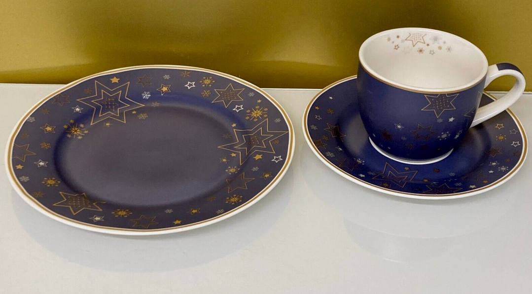 aus New Bone China-Porzellan, wunderschön in einem matten Blau, mit goldfarbenen und weissen Sternen gestaltet