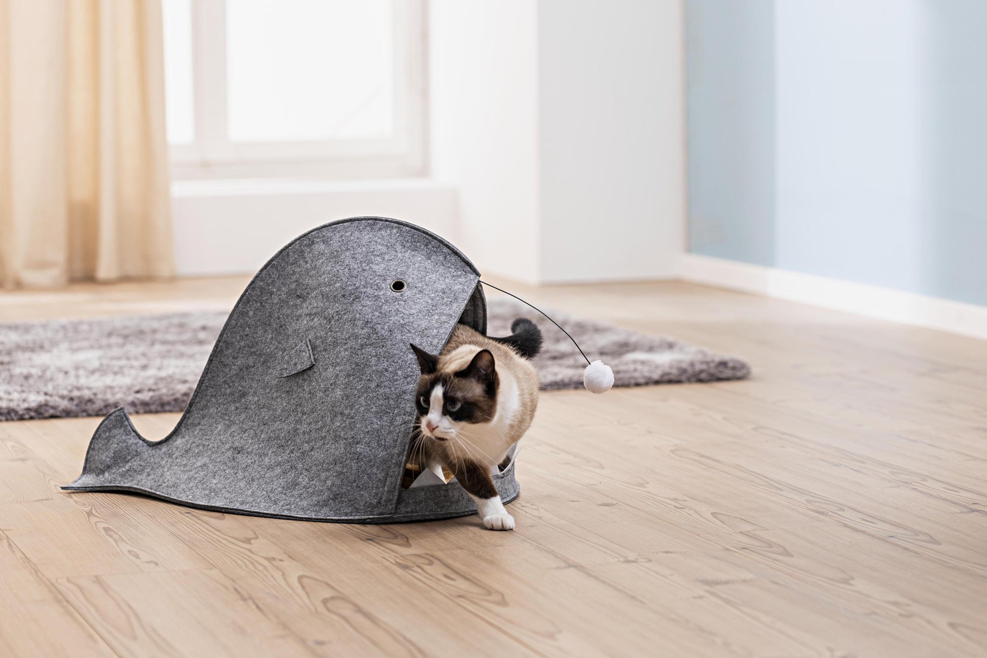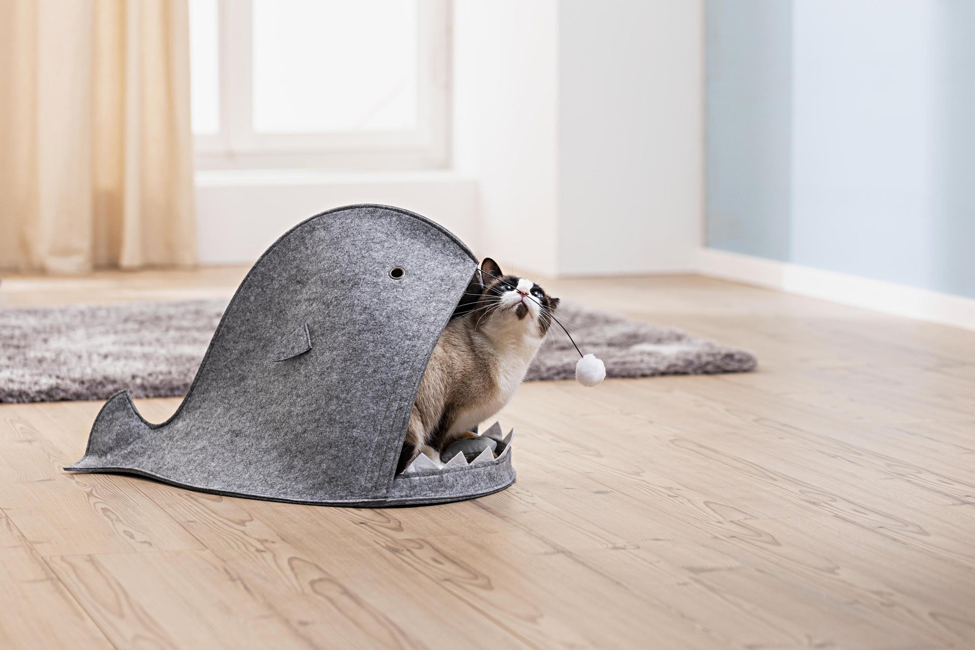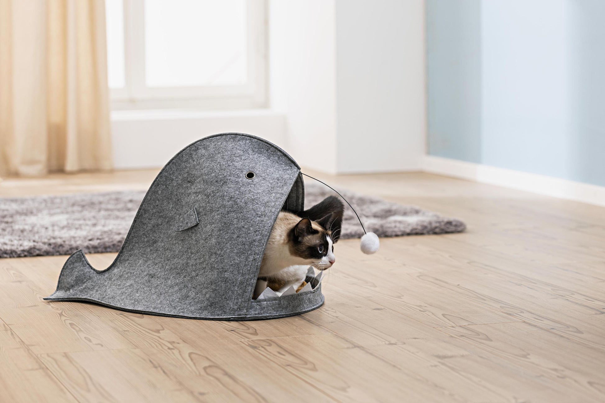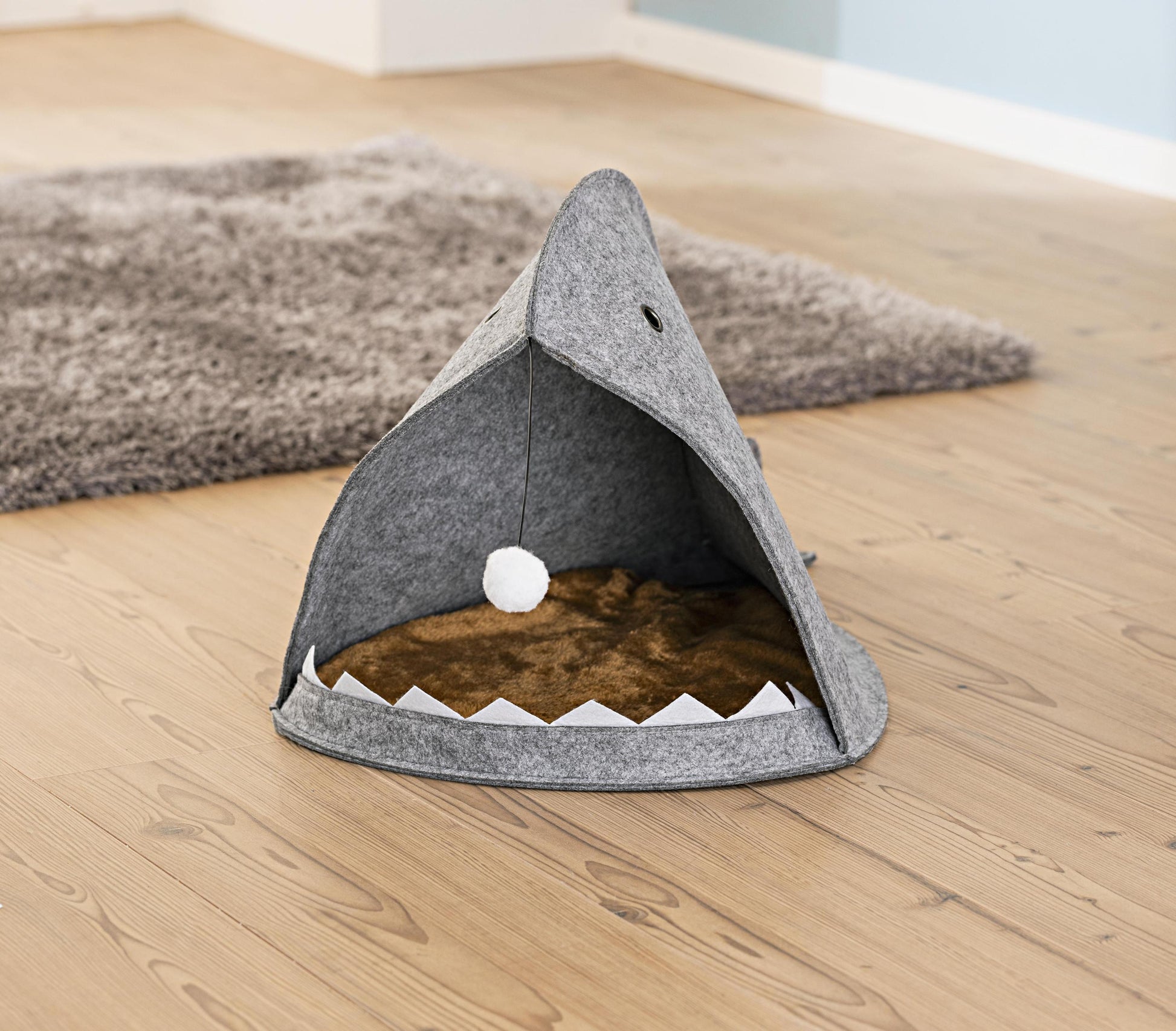 Mit seinem weit geöffneten Maul, den Zähnen und der Spielangel ist die Katzenhöhle "Fisch" ein toller Hingucker, der nicht nur Ihrer Katze Freude machen wird.