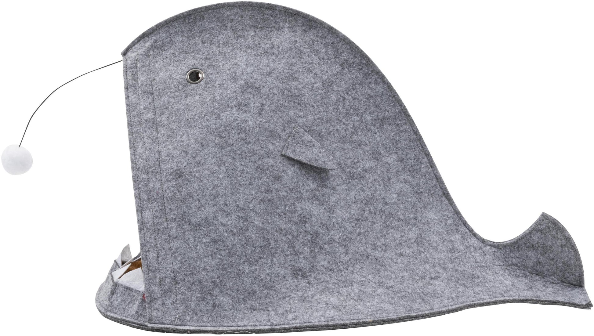 Im Bauch des Anglerfischs ist gut schlummern! Hier liegen Katzen weich und geborgen und aus dem geöffneten "Maul" heraus lässt sich die Umgebung im Auge behalten. Und wenn die Katze ausgeschlafen hat, kann sie mit der an der Katzenhöhle angebrachten Spielangel vergnügen.