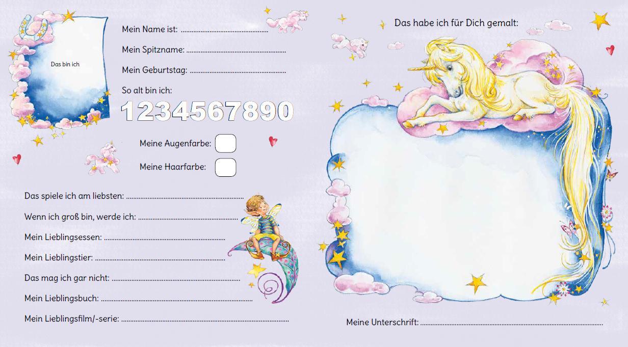 Für alle kleinen Einhornfreundinnen, Feen und Elfen gibt es die perfekte Seite zum Eintragen. Was ist euer Lieblingsessen? Was mögt ihr überhaupt nicht? Und was spielt ihr am liebsten? Dieses tierisch-tolle Freundealbum bietet viel Platz für Fotos und zum Malen eigener kleiner Kunstwerke. Das Papier ist für Filzstifte und Wasserfarben geeignet.