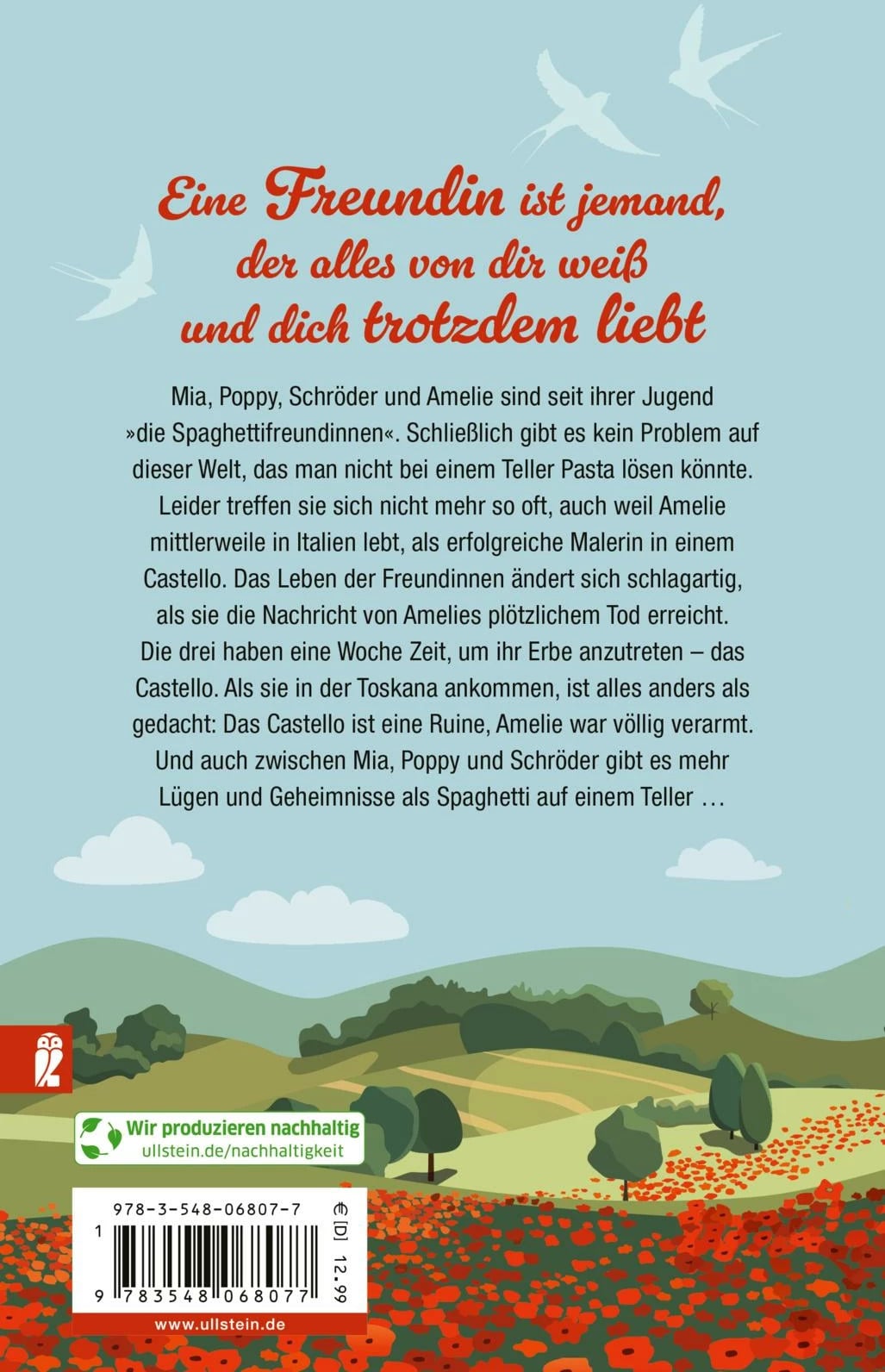 Eine Freundin ist jemand, der alles von dir weiss und dich trotzdem liebtMia, Poppy, Schröder und Amelie sind seit ihrer Jugend »die Spaghettifreundinnen«. Schliesslich gibt es kein Problem auf dieser Welt, das man nicht gemeinsam bei einem Teller Pasta lösen könnte. Leider treffen sie sich nicht mehr so oft, auch, weil Amelie mittlerweile in Italien lebt, als erfolgreiche Malerin in einem Castello. Das Leben der Freundinnen ändert sich schlagartig, als sie die Nachricht von Amelies plötzlichem Tod erreicht. Die drei haben eine Woche Zeit, um ihr Erbe anzutreten - das Castello. Als sie in der Toskana ankommen, ist alles anders als gedacht: Das Castello ist eine Ruine, Amelie war völlig verarmt. Und auch zwischen Mia, Poppy und Schröder gibt es mehr Lügen und Geheimnisse als Spaghetti auf einem Teller ...