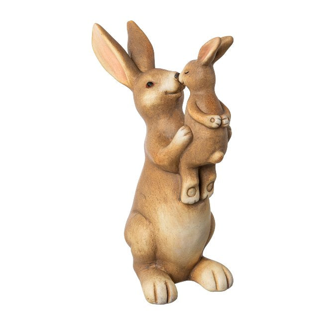 Diese dekorative Hasenfigur zeigt eine rührende Szene zwischen einem grossen Hasen und seinem kleinen Jungtier. Mit viel Liebe zum Detail gestaltet, wirkt die Figur besonders lebendig und bringt eine warme, frühlingshafte Stimmung in Ihr Zuhause.