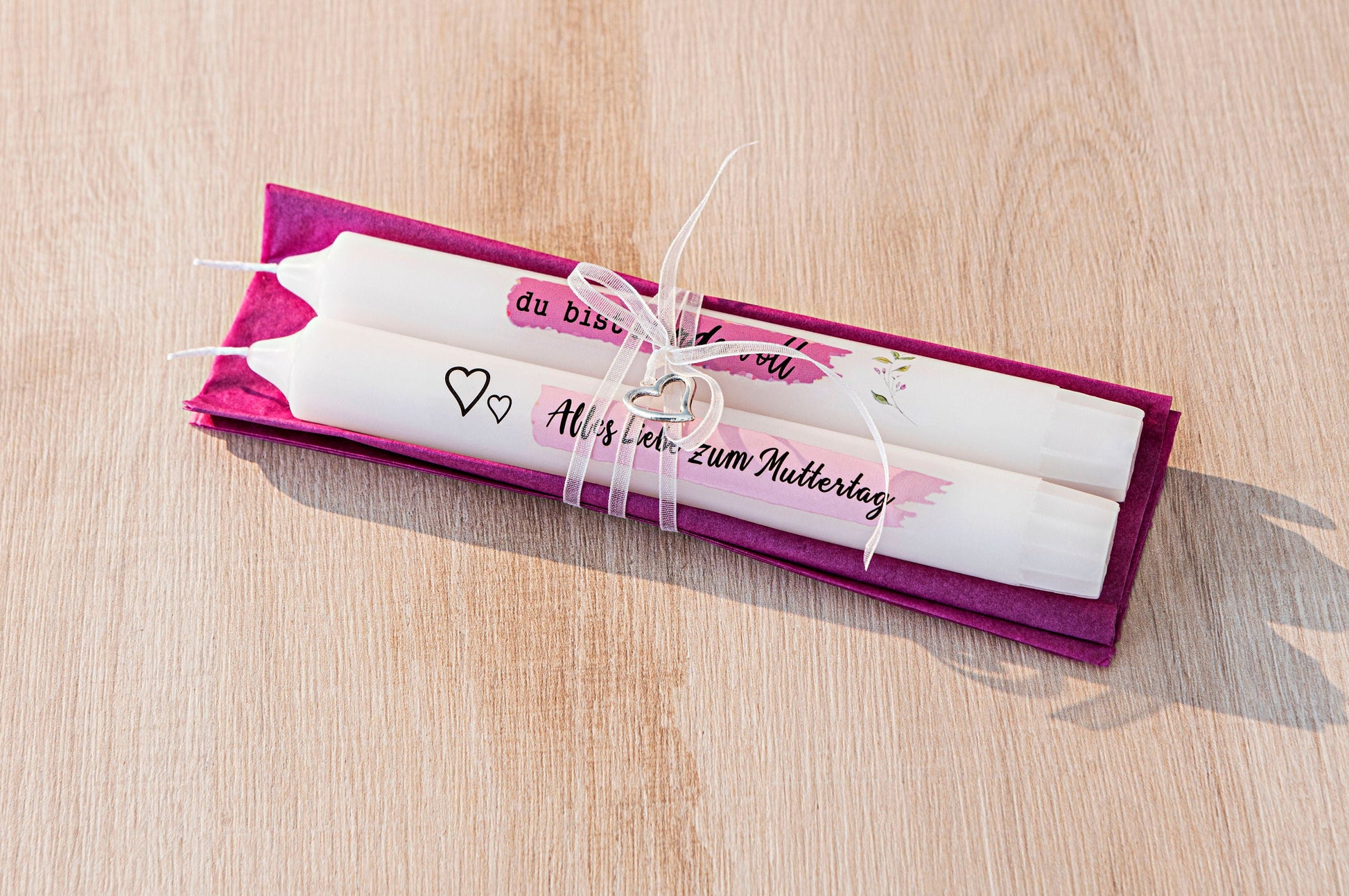 Zum Verpacken liegt Seidenpapier in verschiedenen Farben bereit. Damit und mit den hübschen Herz-Anhängern,   die Sie mit etwas Organgza-Band um die eingewickelten Kerzen binden, haben   Sie ganz schnell zauberhafte kleine Geschenke, über die sich jede Mutter und andere "Herzensmenschen"  freuen. Denn Kerzenlicht und eine liebe Botschaft kommen immer gut an!