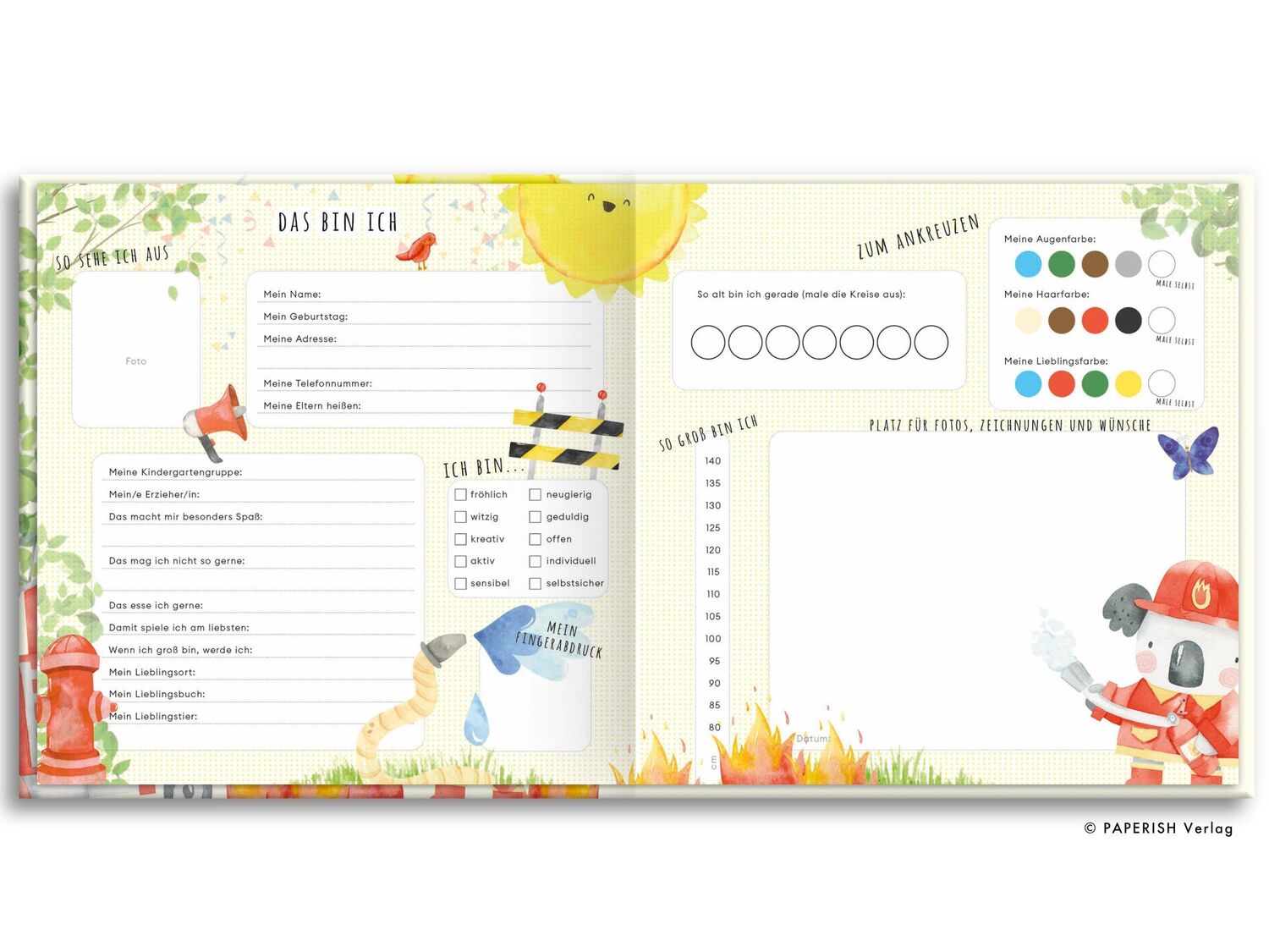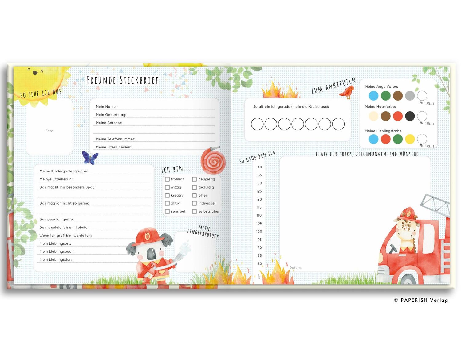 Ein ganz besonderes Freundebuch für begeisterte Feuerwehrfreunde und ihre ersten Begleiter und Begleiterinnen im Kindergarten. Spannende Themen führen durch ein wundervolles Freundealbum, in dem jeder auf besondere Weise eingeladen wird, sich zu verewigen damit die ersten Freundschaften im Leben nicht vergessen werden und später wieder aufleben können. Auf besonders schön gestalteten Seiten kann man reichlich Fragen beantworten, ankreuzen, ausmalen und mitmachen um auf natürliche Weise die soziale Bindung und persönliche Kreativität zu fördern. Damit das Freundschaftsbuch auch lange Freude bereitet, sind die Seiten besonders stabil und der Einband des Buches fest und folienkaschiert. Und für das gewisse Etwas gibt es eine wunderschöne Goldfolienprägung auf dem Cover des Buches, so kann jeder erkennen dass es sich um ein einzigartiges, persönliches Erinnerungsstück handelt. Ein besonderes Geschenk für die Zeit im Kindergarten und die ersten Geburtstage mit Freunden!