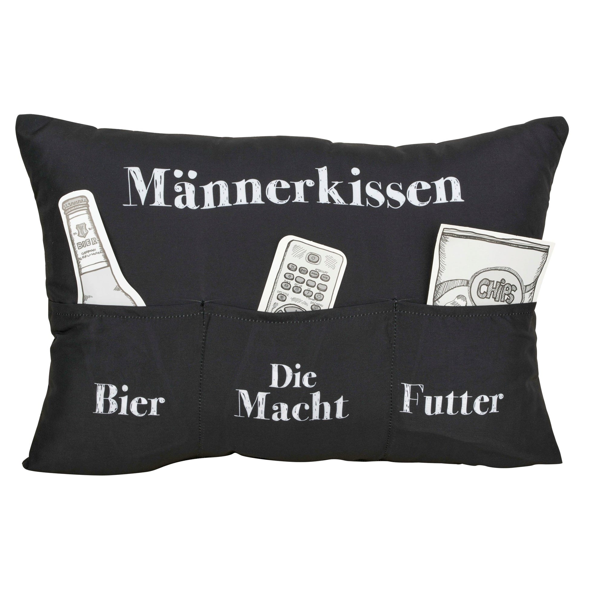 Dieses Kissen ist nicht nur herrlich bequem, es hat zusätzlich drei Außentaschen für Dinge, die „Mann“ stets zur Hand haben sollte: ein kühles Bierchen (alkoholfrei gilt natürlich auch), die Macht (= die Fernbedienung) und Futter, z.B. Chips oder Erdnüsse. Einfach perfekt für einen entspannten Feierabend auf der Couch.