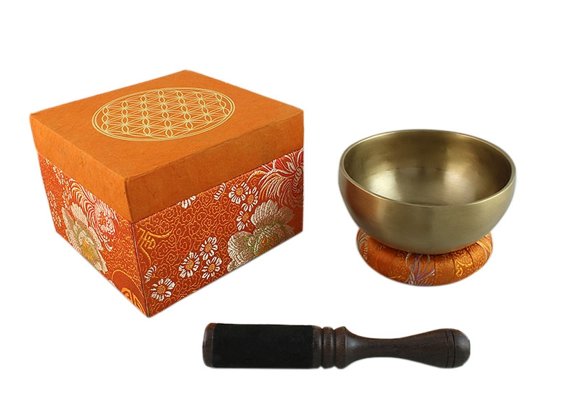 Wunderschönes 4-teiliges Klangschalen-Set bestehend aus gehämmerten Klangschale, orange Ringkissen, Lederklöppel und orange Geschenkbox mit Brokat. Die Klangschale ist von Hand gehämmert und innen am Boden wurde die Blume des Lebens eingraviert. Oben auf der Geschenkbox wurde mit gelber Farbe die Blume des Lebens aufgemalt. Die gehämmerte Klangschale hat einen wunderschönen langanhaltenden hohen Ton. Aufgrund der Schwingung ist sie auch sehr gut geeignet für Meditation und Klangmassage. Aufgrund der Handarbeit kann es zu geringen Abweichungen zum Produktbild kommen.