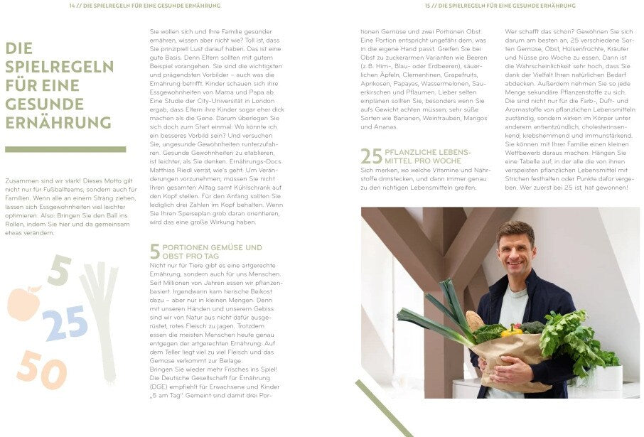 Dr. med. Matthias Riedl ist ärztlicher Direktor und Gründer des medicum Hamburg, das die Diabetologie mit der Ernährungsmedizin und neun angrenzenden Facharztrichtungen ganzheitlich verbindet. Einem breiten Publikum ist er vor allem als TV-Ernährungs-Doc bekannt. Dr. Riedl hat zahlreiche Bestseller verfasst und sitzt im Vorstand des Bundes Deutscher Ernährungsmediziner.Thomas Müller, Fussball-Star und Weltmeister von 2014, gehört zu den erfolgreichsten deutschen Fussballprofis. Aktiv ist er aber nicht nur auf dem Rasen: Neben sozialen Projekten engagiert er sich u.a. für die Leseförderung und wurde dafür 2021 mit dem Deutschen Lesepreis ausgezeichnet. Abseits des Spielfelds ist Thomas Müller sehr interessiert an gesunder Ernährung und will Menschen motivieren, neue Dinge in der Küche auszuprobieren. Dr. med. Matthias Riedl ist ärztlicher Direktor und Gründer des medicum Hamburg, das die Diabetologie mit der Ernährungsmedizin und neun angrenzenden Facharztrichtungen ganzheitlich verbindet. Einem breiten Publikum ist er vor allem als TV-Ernährungs-Doc bekannt. Dr. Riedl hat zahlreiche Bestseller verfasst und sitzt im Vorstand des Bundes Deutscher Ernährungsmediziner.Thomas Müller, Fussball-Star und Weltmeister von 2014, gehört zu den erfolgreichsten deutschen Fussballprofis. Aktiv ist er aber nicht nur auf dem Rasen: Neben sozialen Projekten engagiert er sich u.a. für die Leseförderung und wurde dafür 2021 mit dem Deutschen Lesepreis ausgezeichnet. Abseits des Spielfelds ist Thomas Müller sehr interessiert an gesunder Ernährung und will Menschen motivieren, neue Dinge in der Küche auszuprobieren.