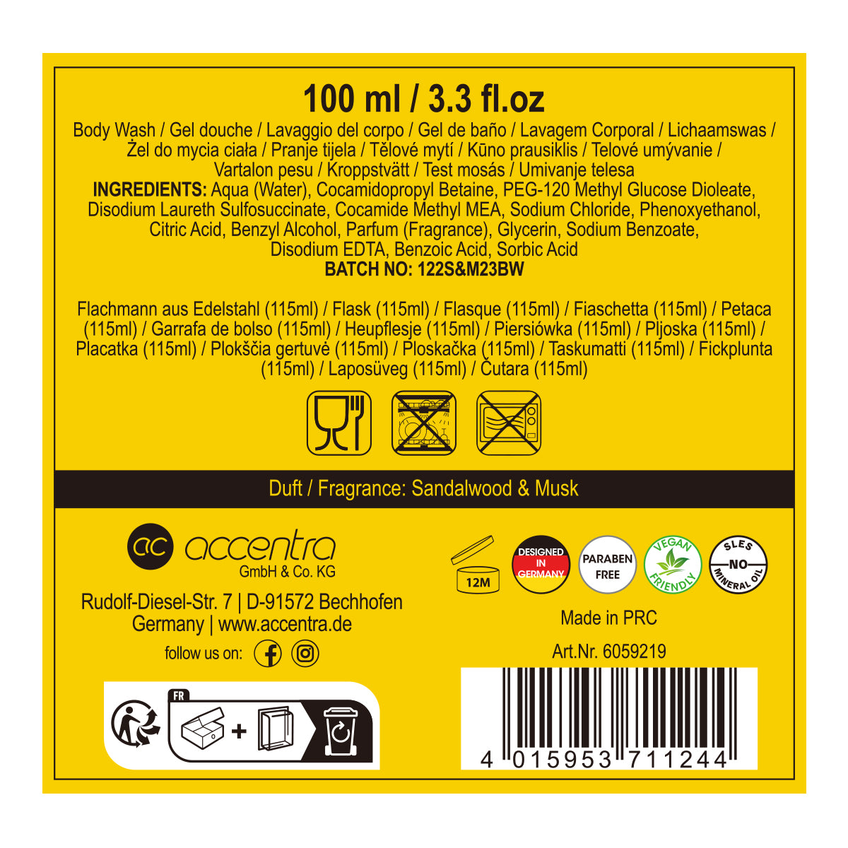 Entdecken Sie das perfekte Geschenk für den modernen Mann mit dem Bad und Body Geschenkset von Accentra. Dieses stilvolle Set enthält ein 100 ml Bodywash, das sanft reinigt und erfrischt, sowie einen eleganten 115 ml Flachmann aus Edelstahl in praktischer Kanisterform – ideal für unterwegs. Der verführerische Duft von Sandelholz und Moschus sorgt für ein unvergessliches Dufterlebnis, das Selbstbewusstsein und Stil ausstrahlt. Verschenken Sie Wohlbefinden und Eleganz in einer ansprechenden Geschenkbox!