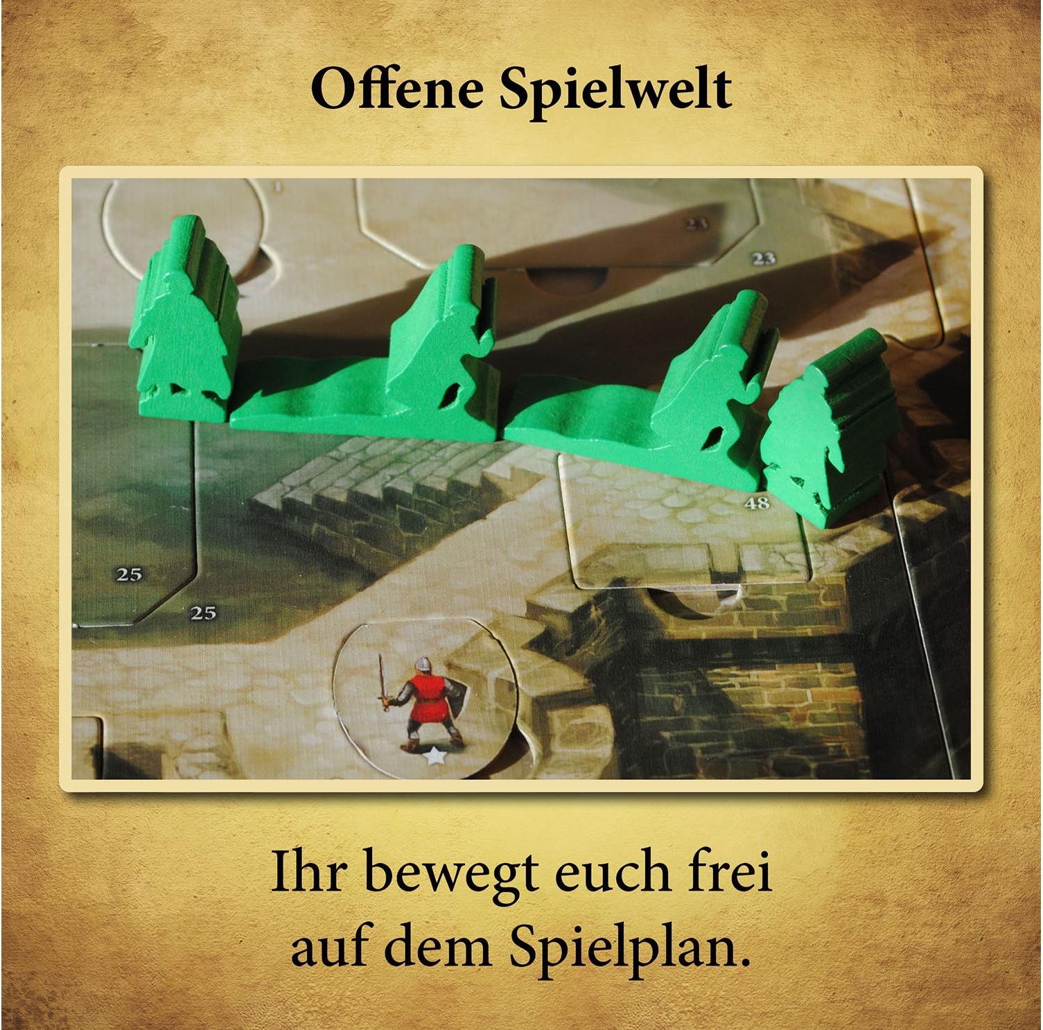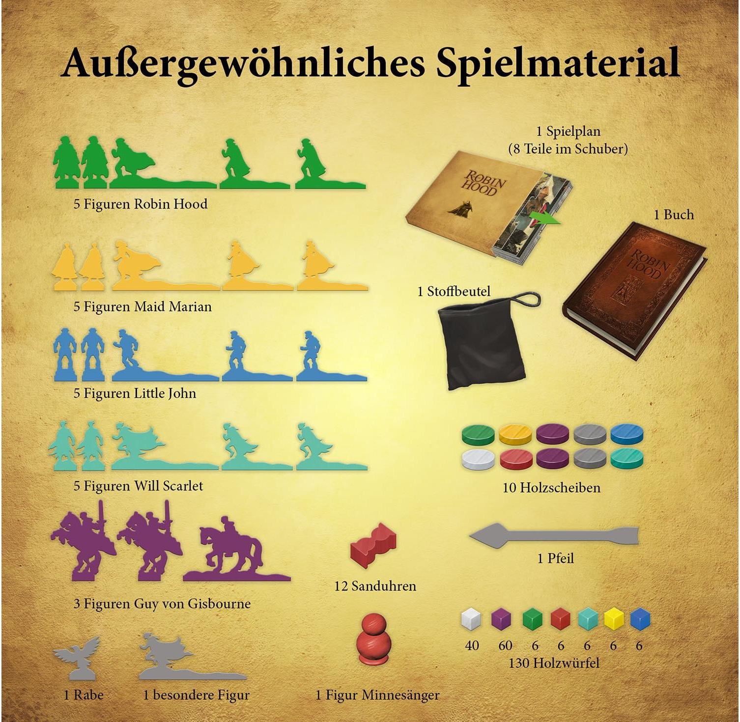 England 1193. Die Grafschaft Nottingham leidet unter dem Joch des bösen Prinz John und seiner Handlanger. Ihr schlüpft in die Rollen von Robin Hood und seiner Gefährten Little John, Maid Marian und Will Scarlet. Gemeinsam stellt ihr euch in diesem Spiel dem Unrecht entgegen und kommt dabei einem dunklen Geheimnis auf die Spur. Auf dem grossen Spielplan könnt ihr eure Figuren völlig frei bewegen, mit Dorfbewohnern sprechen und Gegenstände erkunden. Stets müsst ihr euch dabei vor den Schergen des Sheriffs von Nottingham in Sicherheit bringen. Aufbauen und losspielen ihr startet sofort ins erste Abenteuer. Das im Brettspiel enthaltene Buch begleitet euch durch die spannende Geschichte. Ein tolles Geschenk nicht nur für Robin-Hood-Fans.