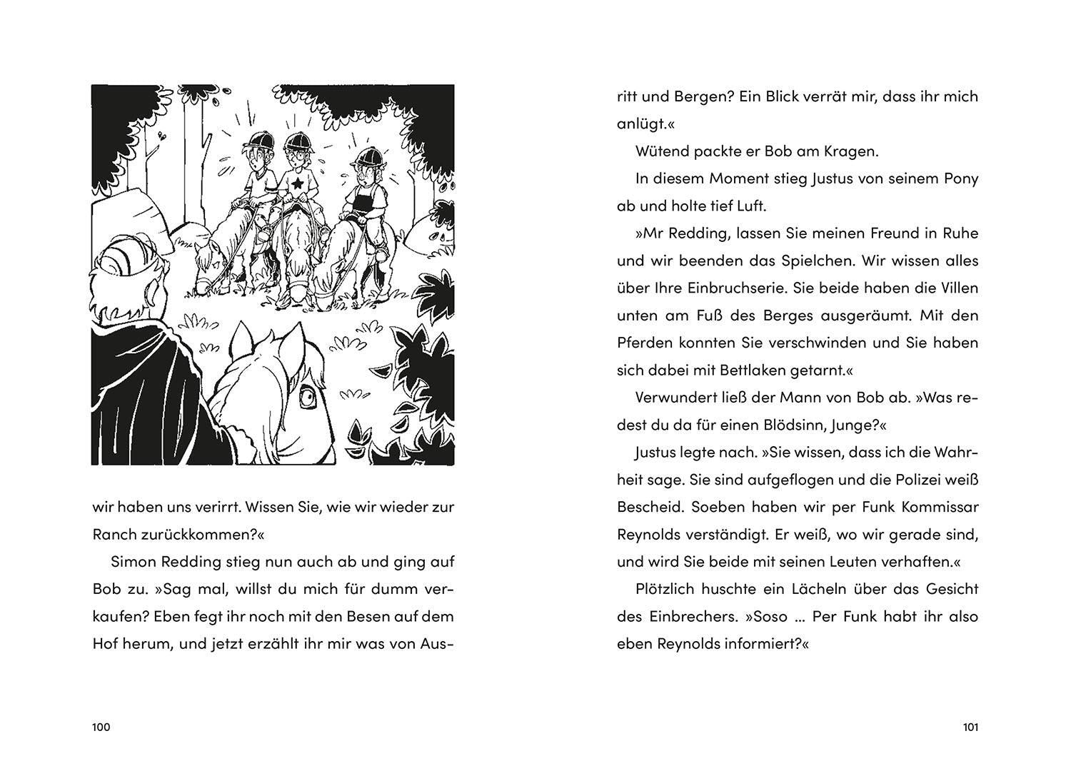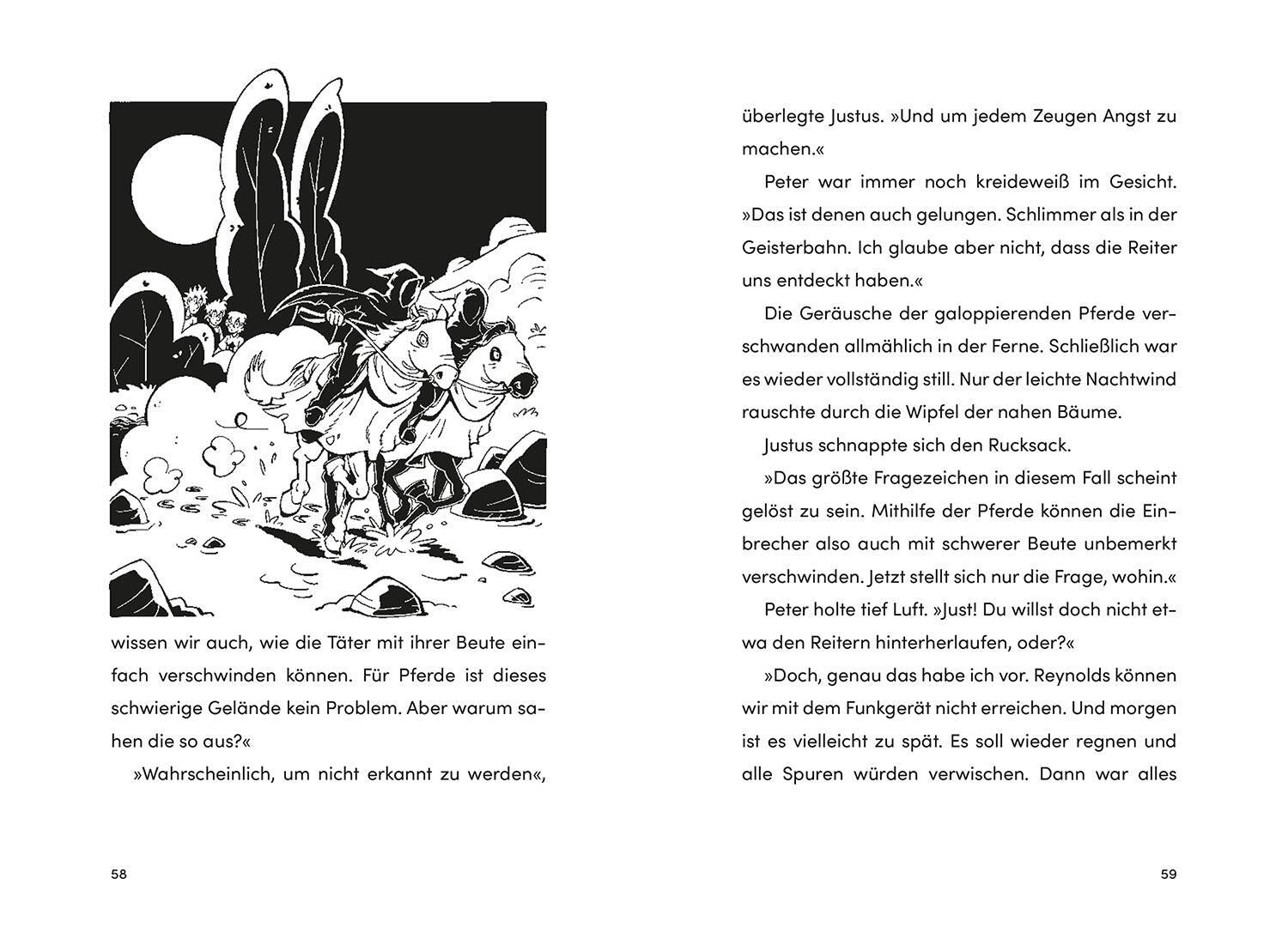Wer steckt hinter den Einbrüchen im Villenviertel? Die drei ??? helfen Kommissar Reynolds dabei, die Übeltäter zu suchen. Obwohl die Gegend von Streifenwagen überwacht wird, gelingt es den Dieben auf mysteriöse Weise, schnell zu verschwinden. Während einer nächtlichen Streife beobachten die Detektive und der Kommissar geisterhafte Gestalten, die mit Diebesgut auf Pferden flüchten. Auf den Fotos können sie nichts erkennen, da die Pferde verhüllt sind. Aber sie entdecken einen Reiterhof in der Nähe. Stammen die Pferde vielleicht von dort? Undercover starten Justus, Peter und Bob ihre Ermittlungen und erfahren dabei viel übers Reiten und über Pferde.