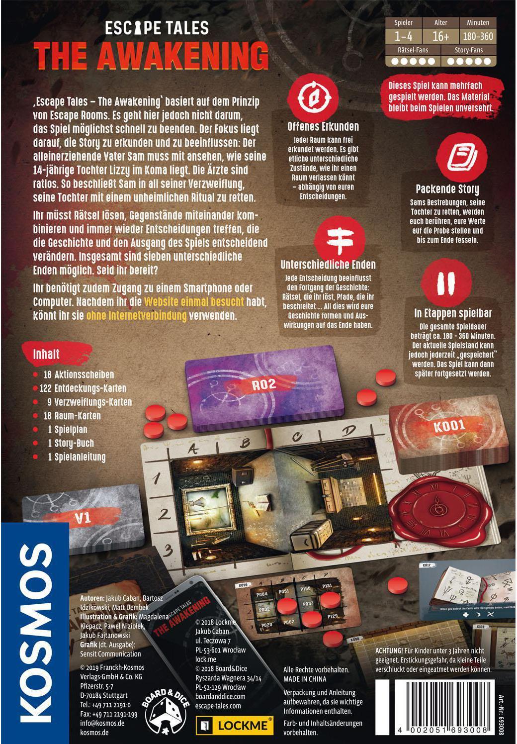 Anders als bei EXIT geht es beim Brettspiel The Awakening jedoch nicht darum, das Spiel möglichst schnell zu beenden. Stattdessen wird der Fokus auf eine packende und düstere Hintergrundgeschichte gelegt: Der alleinerziehende Vater Sam muss mit ansehen, wie seine 14-jährige Tochter Lizzy ins Koma fällt. So beschliesst Sam in all seiner Verzweiflung, seine Tochter mit einem unheimlichen Ritual zu retten. Die Spieler lösen Rätsel, kombinieren verschiedene Gegenstände miteinander und treffen immer wieder Entscheidungen, die die Geschichte und den Ausgang des Spiels entscheidend verändern. Sieben unterschiedliche Varianten, wie die Geschichte endet, sind möglich. Das Spiel wird von einer Webseite unterstützt. Inhalt: 1 Spielplan, 18 Raum-Karten, 122 Entdeckungs-Karten, 9 Verzweiflungs-Karten, 18 Aktionsscheiben, 1 Story-Buch, 1 Spielanleitung.