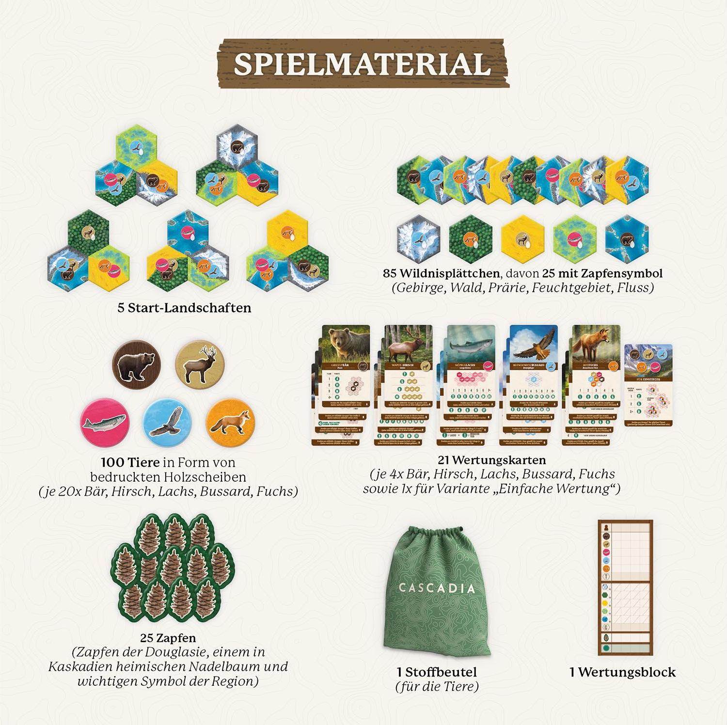 Willkommen in Cascadia. Hier, im Nordwesten Amerikas, fühlen Tiere sich wohl: Bussarde kreisen in den Lüften, Bären treten paarweise auf, Hirsche machen sich auf die Wanderung und Füchse streifen umher. Und natürlich dürfen auch die Lachse nicht fehlen. Auf ihren Flusswanderungen durchqueren sie weite Landschaften. 1-4 Spielerinnen und Spieler ab 10 Jahren haben alle Wildtiere im Blick und legen in ihrem Spielzug ein neues Wildnisplättchen an ihre Landschaft an. Die unterschiedlichen Wertungskarten geben vor, wie die Tiere angesiedelt werden sollten. Bonuspunkte gibt es für die grössten zusammenhängenden Gebiete in jeder Landschaftsart. Dank des leichten Zugangs gleich das Spiel beginnen und ein Zuhause für viele Tiere schaffen -mit etwas Glück und der richtigen Taktik. Ein abwechslungsreiches Familienspiel und passendes Geschenk für Fans von Legespielen sowie Naturfreundinnen und Naturfreunden - mit Solo-Spielvariante auch alleine spielbar.