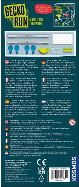 Die Kugeln lernen das Fliegen: Mit dem Trampolin erhält jede Gecko Run-Bahn eine aufregende Erweiterung. Wie weit kann die Kugel fliegen? Kann sie sogar zurück auf einen höheren Abschnitt katapultiert werden? Spannende Experimente rund um Sprungkraft und Flugbahnen warten. Zusätzliche Bahn-Elemente vergrößern die Reichweite: mit 2 zusätzlichen Bahnen und einer Brücke bietet Gecko Run noch mehr Möglichkeiten. Mit dem Trampolin sind die Kinder ab 8 Jahren genauso frei wie mit den Teilen des Starter Sets: Ob um die Ecke, über Hindernisse weg, an Türen, Glasscheiben, oder Regalen – freies Bauen! Die perfekte Erweiterung für Gecko Run von KOSMOS, für noch rasantere Bahnen mit Sprungkraft. Hinweis: nur mit dem Gecko Run „Starter Set“ spielbar. Mit dem Trampolin wird die Bahn um ein spektakuläres Element erweitert: Wie muss ich das Trampolin ausrichten, damit die Kugeln besonders weit oder hoch fliegen? Kann ich die Kugel sogar zurück auf einen höher liegenden Streckenabschnitt katapultieren? Spannende neue Fragen, die die Kinder ab 8 Jahren austüfteln können! Die Anleitung gibt den ersten Kick mit tollen Ideen für die Tricks. Das tolle Extra: Zusätzliche Bahn-Elemente aus vergrößern die Reichweite der KOSMOS Kugelbahn! Hinweis: nur mit dem Gecko Run „Starter Set“ spielbar.