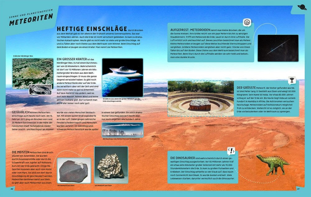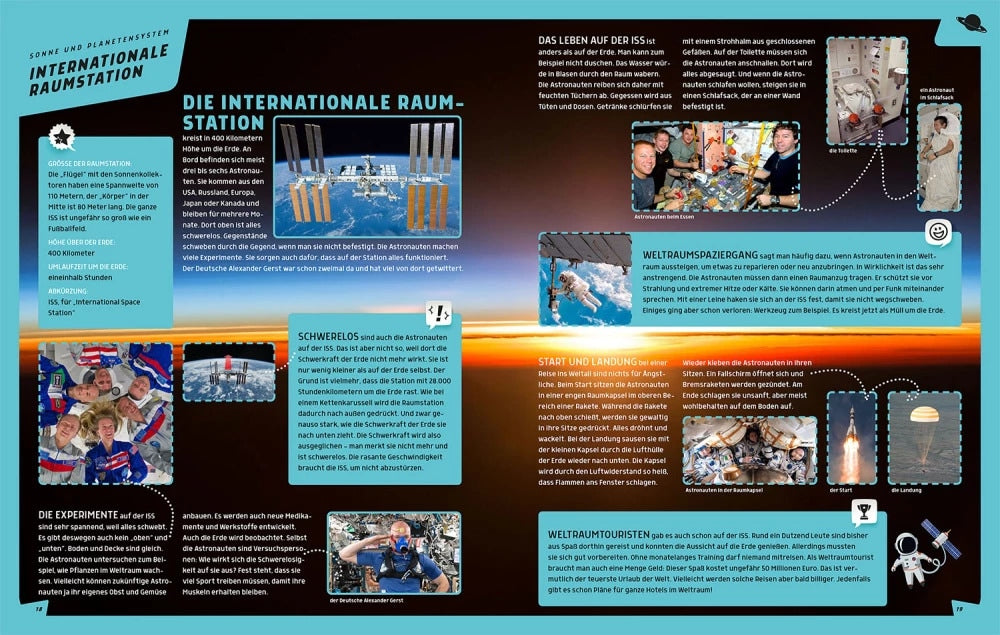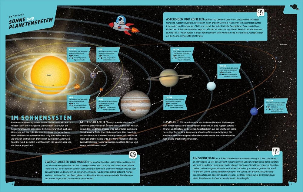 Wie entstehen schwarze Löcher? Gab es den Urknall wirklich? Gibt es außerirdisches Leben? Wie wird auf der ISS gearbeitet? Los geht es auf die Reise zu Planeten, Sternen und fernen Galaxien. Großformatige Sternkarten und Ausklappseiten, spektakuläre Fotos und Illustrationen vermitteln einen Eindruck der riesigen Dimensionen des Weltraums. Spannende Texte beschreiben kosmische Zusammenhänge und Besonderheiten der Himmelsobjekte. Sie laden dazu ein, den Sternenhimmel und das Weltall zu erkunden. Für Kinder im Grundschulalter, die sich für das Thema Astronomie begeistern und noch mehr erfahren möchten. Mit vielen Tipps und Tricks für die eigene Himmelsbeobachtung.