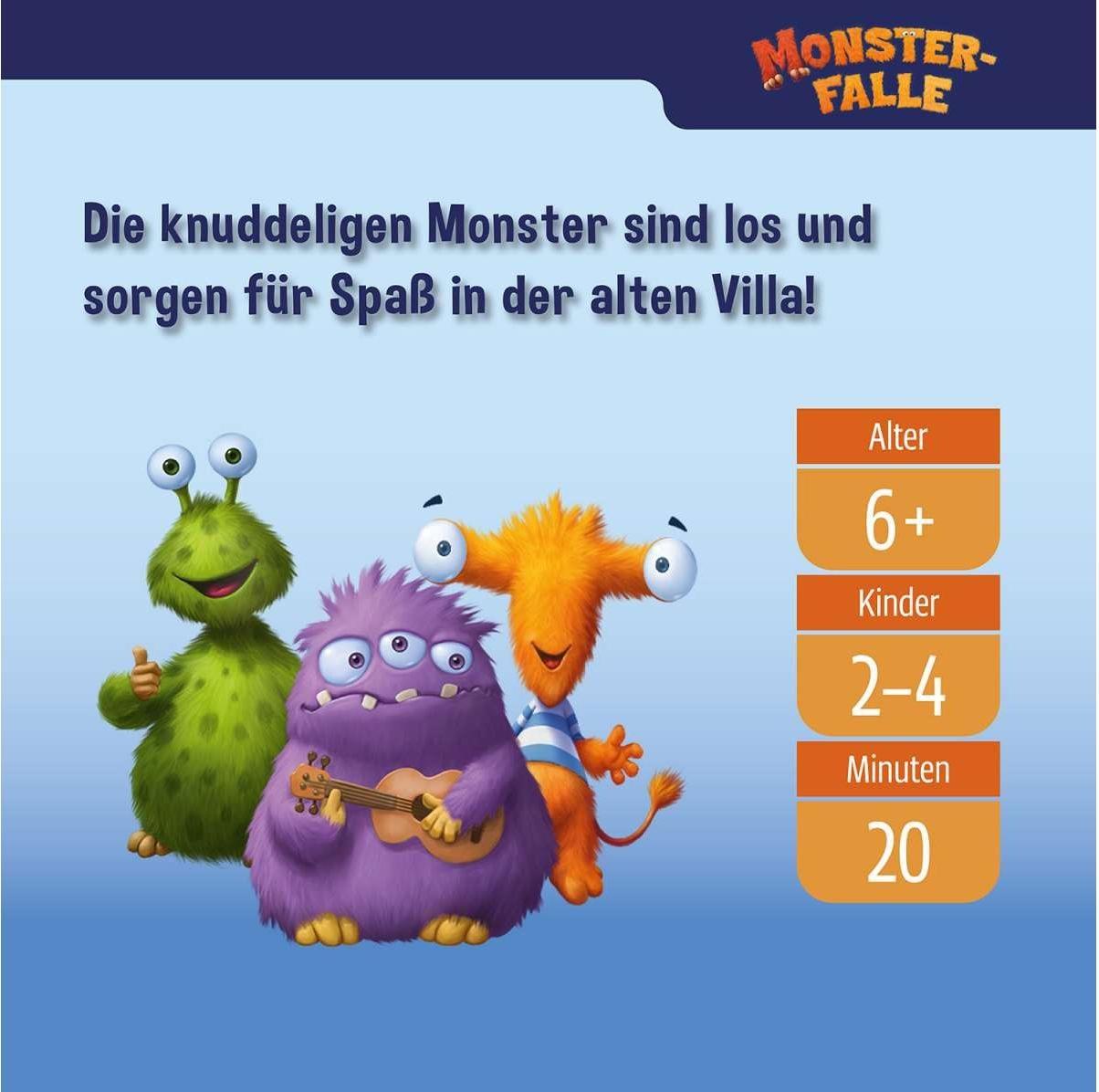 Die Monster sind los! Super, denn die lustigen Monster sorgen für ganz schön viel Spaß in der alten Villa. Doch plötzlich steht Oma Frieda vor der Tür und die würde vor den Monstern fürchterlich erschrecken. Bei diesem Kinderspiel ab 6 Jahren sind jetzt geschickte Monsterjägerinnen und Monsterjäger gefragt: Helft alle mit, die lustigen Monster einzufangen! Dabei hilft der clevere Spieleaufbau mit Schiebemechanismus. Schiebt sie so schnell wie möglich durch die Villa und schubst sie dann schwups in die Monsterfalle! Wer geschickt ist und sich gut mit den anderen Kindern abspricht, fängt bei diesem rasanten Schiebespaß die meisten Monster.