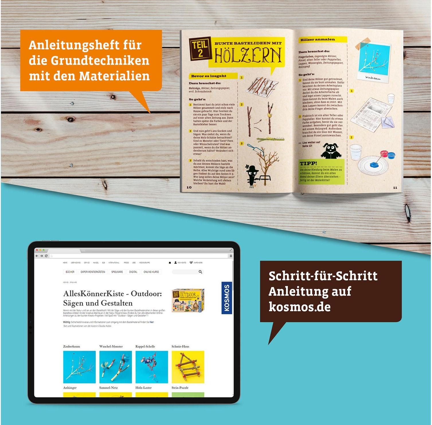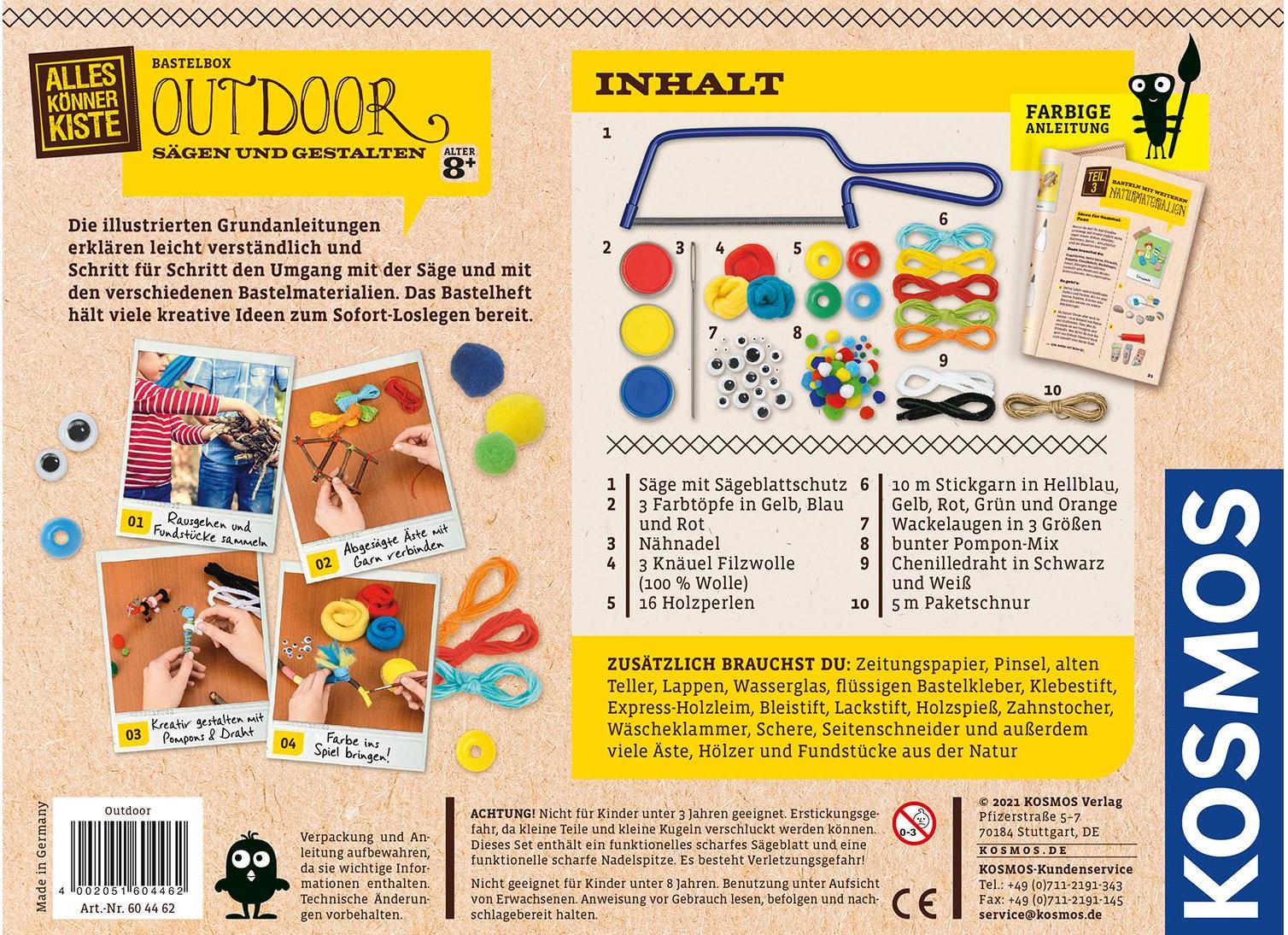 Suchen, sammeln, sägen. Äste, Blätter, Blüten, Steine - jede Menge wunderschöner Schätze finden sich draussen in der Natur. Schritt für Schritt entstehen mit dieser AllesKönnerKiste einzigartige und kreative Traumfänger, bunte Mobiles, verrückte Waldgeister, Steintiere, Naturpinsel und vieles mehr. Die ausführlich bebilderte Anleitung erklärt Kindern ab 8 Jahren den fachgerechten Umgang mit der handlichen Säge und liefert wertvolle Tipps für den Umgang mit Filzwolle, Pompons, Farbe, Chenilledraht und weiteren Bastelutensilien, sodass das eigene DIY-Bastelprojekt mit Naturmaterialien gelingt. Worauf noch warten? Das Abenteuer Natur ruft.