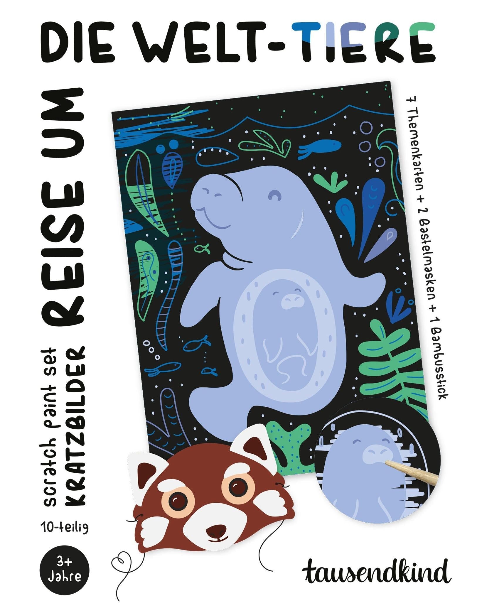 Kratzbilder sind eine beliebte Kreativbeschäftigung bei Kindern. Das Kreativset Kratzbilder „Reise um die Welt – Tiere“ von tausendkind ist zudem spannend und informativ und bietet vielfachen Spaß. Nach und nach wird ein farbenfrohes Bild unter der schwarzen Schicht freigekratzt und die Kinder lernen Tiere der ganzen Welt kennen. Nach dem Freikratzen der Vorlagen mit dem beiliegenden Stift aus Bambusholz zeigen sich farbenfrohe niedliche Motive von Tier-Mamas in ihrem natürlichen Lebensraum mit einem Tier-Baby im Bauch. Lieblingstiere wie Pinguin, Koala. Bär, Hase u.a. warten auf die kleinen Künstler. Auf der Rückseite der Kratzbilder gibt es jeweils ein Ausmalbild. Und die zwei Bastelmasken im Set sind ein tolles Accessoire für die fantasievolle Reise zu den Tieren der Welt.