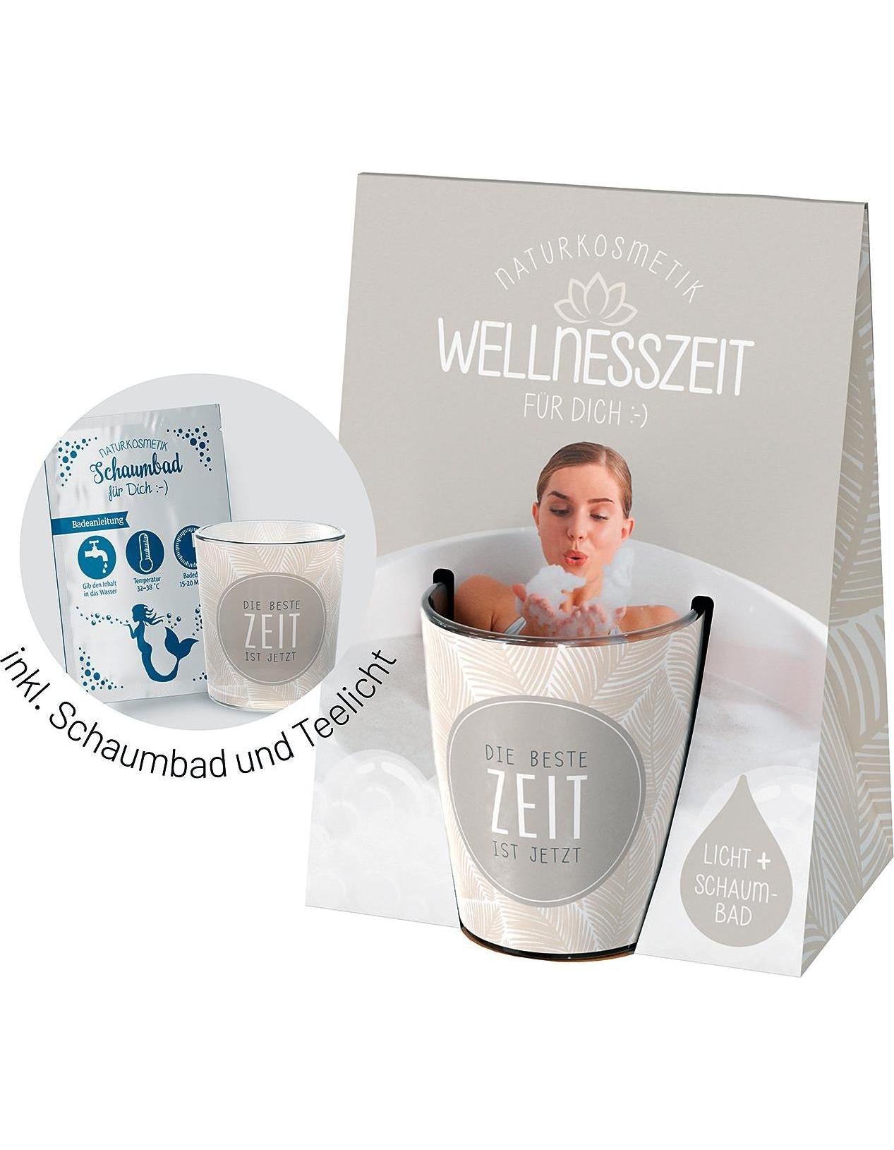 Wellnesszeit Dieses Set eignet sich perfekt als Geschenk, um jemandem eine Freude zu machen. Das wohlriechende Duschgel und das schöne Windlicht (inkl. Teelicht) sind die perfekte Kombination und laden zum entspannenden Baden bei Kerzenlicht ein. Inhalt: Schaumbad + Licht Masse: 14 x 10,2 x 8 cm (Verpackung).